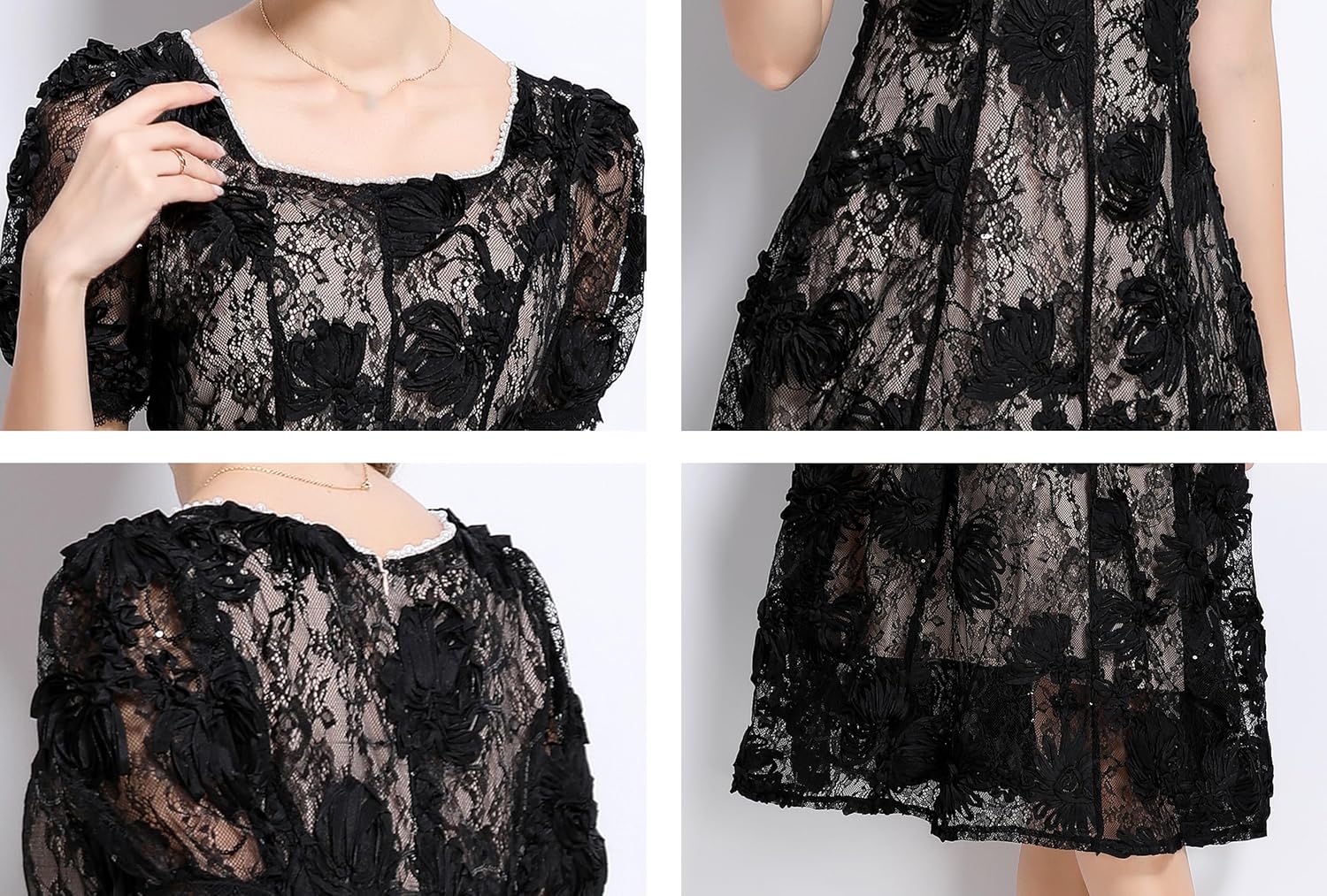 LAI MENG FIVE CATS Women's Pearl Square Neck Lace 3D Floral Short Sleeve Pleate Party Midi Dress