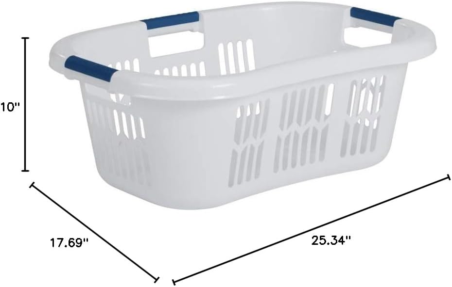 Large Hip-Hugger Laundry Basket/Hamper, 1.5-Bushel, White, Stackable Storage Bin/Organizer for Bathroom/Bedroom/Dorm/Home **Lightweight, easy to lift plastic laundry basket**Curved design rests on hip for comfortable one-handed carrying**Three sturdy grab-through handles**Sturdy construction and smooth finish prevent snags on delicate items**Size: 17.75"L x 9.38"W x 25.75"H**Made in the USA Lightweight, easy to lift plastic laundry basket Curved design rests on hip for comfortable one-handed carrying Three sturdy grab-through handles