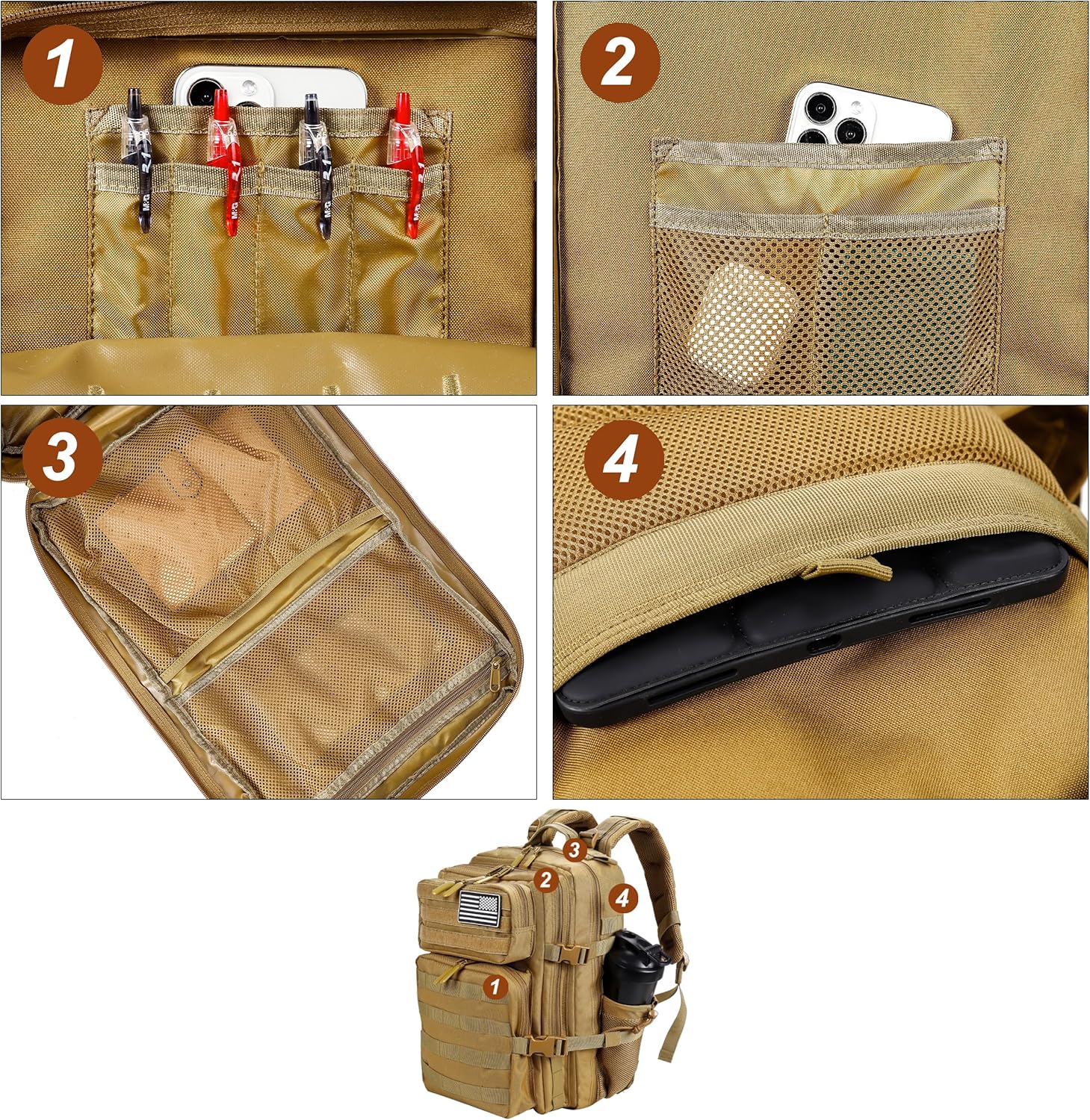 DescriptionThis backpack has multi-compartment and zippered closure pockets including an interior zip pocket and mesh pocket, it allows you to put almost all necessities inside, and it is ideal for outdoor activities and military enthusiasts, and also cool for fashion lovers!This tactical assault backpack can be used as a 3-day assault pack, bug bag backpack, army backpack, hunting backpack, military survival backpack, trekking backpack, or day pack for daily use.SpecificationSize:12''W X 20''H X 12"D.Weight:1.25KGCapacity:45LMaterial:900D oxford waterproof fabricFeatures1. Molle SystemTactical backpack has molle system, Plenty of mount points on the outside of tactical backpack for add-on pouches, designed to be used in combination with other equipment, you can load pockets, water bottle bag, accessory kits, and other to expand the capacity and loading.2. Comfortable Breathable Shock Absorbing Back PadStreamlined straps, designed according to ergonomics, will not feel tired when you are burdened for a long time, play a role in shock absorption and relieve pressure.3. Large capacityWith a capacity of 45L, it allows you to put almost all necessities inside and meets your demands in daily life and outdoor camping.4. Waterproof FabricIt is made of 900 oxford fabric, high-density waterproof fabric with big loading ability, and with excellent waterproofness, which is suitable for all kinds of weather, and suitable for an outing.5. Bottle holderThe Tactical backpack has a bottle holder on both sides of the backpack, which can fit for 750ml water bottle, umbrellas, or tools.Package Include1x 45L Tactical Backpack1x Patch(Sent at random)