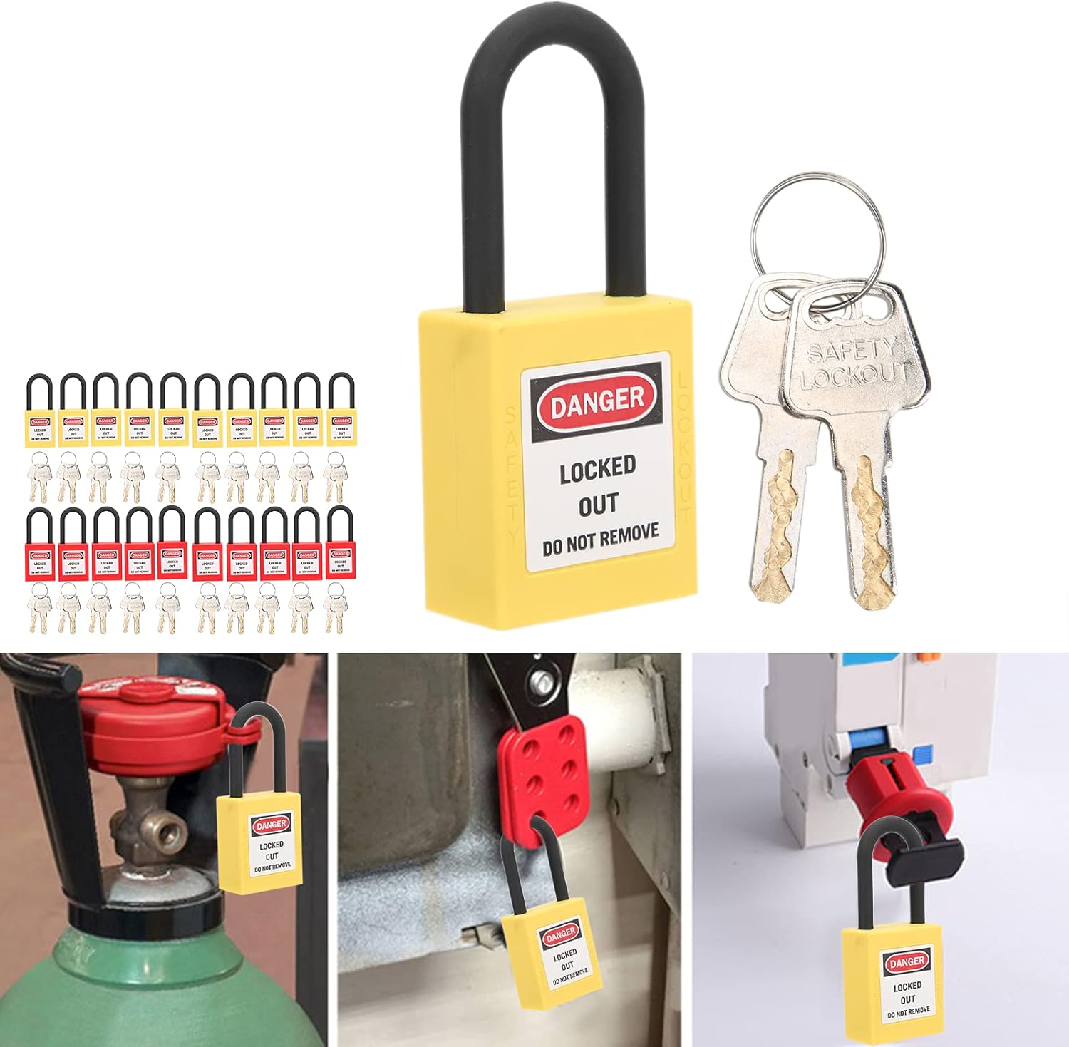Feature:1. The key cannot be removed when the padlock is opened, and the key will not be lost when it is not locked.Specification:Item Type: Lockout LockMaterial: Nylon PAUse: Suitable for factories, construction sites, hospitals, chemicals, power plants and other industrial sites; specifically for lockout/tagoutSize: Lock beam diameter 6mm/0.24in, length 38mm/1.5inPackage List:10 x Lockout Lock 20 x Key
