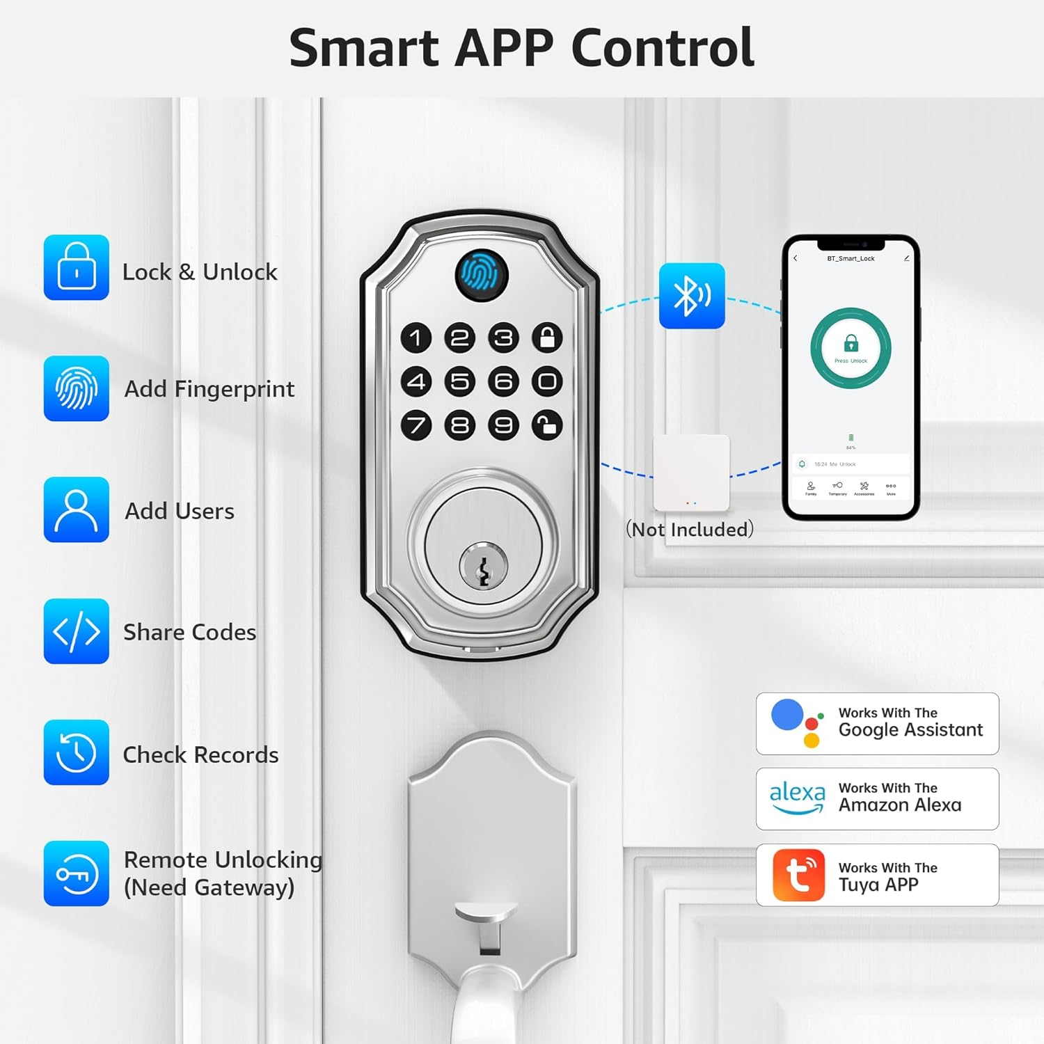 • 【5 in 1 Front Door Lock Set】 LOCK&SOLVER smart deadbolt lock can be unlocked by APP + Fingerprint + Keypad Code + Ekey + Mechanical Key, which can support 50 user fingerprints and 250 PINs. The door lock set includes 1 lock-body, 2 mechanical keys, 1 installation guide, and all materials needed for installation