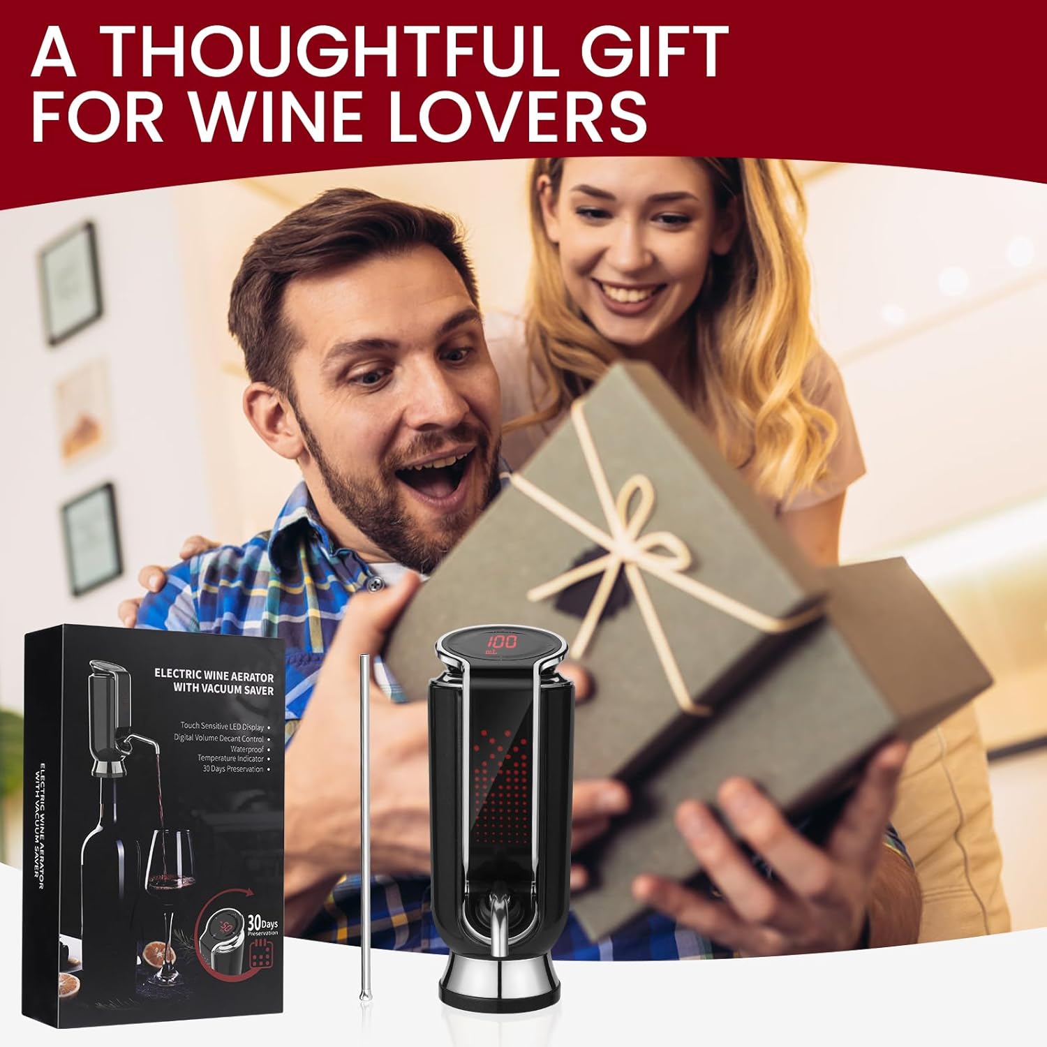 Elevate your wine experience with our Luxurious 4-in-1 Electric Wine Aerator Decanter Dispenser & Vacuum Saver with LED Display. This sophisticated device is designed to transform every pour into a moment of luxury, perfect for personal enjoyment or impressing guests at gatherings. Here’s why our wine accessory is a must-have: Revolutionary Smart Vacuum Preservation Technology High-pressure oxygenation technology, quick decanting Precision Pouring with LED Digital Touch Screen Digital Real-Time Monitoring of Wine Temperature and Wine bottle pressure The Perfect Gift for Any Occasion Key Features: Luxury Design & Durability: Crafted with a luxurious, elegant design, our 3-in-1 wine gadget seamlessly blends into sophisticated settings. Its robust construction ensures lasting durability, making it a timeless addition to your wine collection. LED Display: Easy-to-read digital touch screen for precise control and monitoring. Maintenance: Simple to clean and maintain, ensuring hassle-free usage. Warranty: Includes a 1-year comprehensive warranty covering any manufacturing defects or malfunctions to ensure your satisfaction and peace of mind. Usage Instructions: Setup: Easily assemble and attach to your wine bottle. Operation: Use the touch screen to set your desired wine amount and enjoy perfectly aerated wine instantly. Simple button operation: Long press the power button to turn on and off the machine, and the LED screen will display the current negative pressure value/battery level/temperature in a loop. Long press +/- to quickly adjust the amount of wine dispensed. Double-click the dispense button to start dispensing wine. Double-click the power button to vacuum. Whether for personal use or as a luxurious gift, this product is designed to impress and enhance every wine-drinking occasion.