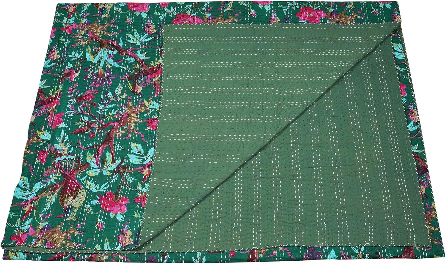 Made with 100% cotton and natural vegetable colors. This piece is of art is completely hand stitched by Women artisan in Rajasthan, India. A beautiful creation to give your home a traditional yet authentic colorful look with this beautiful kantha quilt blanket or throw which can also be used as handmade tropical Kantha bedspread bedding. This piece is of art is completely hand stitched by Women artisan in Rajasthan, India. The entire quilt is hand embroidered with end number of straight running stitches to create a unique product, one of it's kind.These quilts are famed and admired due to their Kantha work. They have different beautiful warm and charming colors, designs and patterns on either side which gives a distinct look. These cotton lightweight "Quilts" can be used as Bedspread , Bedding Throw , Blanket Or Quilt, A Summer Bed Cover, A Fabulous Picnic Rug, Nice Bedroom Quilt This can fit to a King size bed as blanket or throw or can easily fit as bedspread / bed cover to King bed . Washing Instruction – Easy To Hand Wash & Dry Clean.