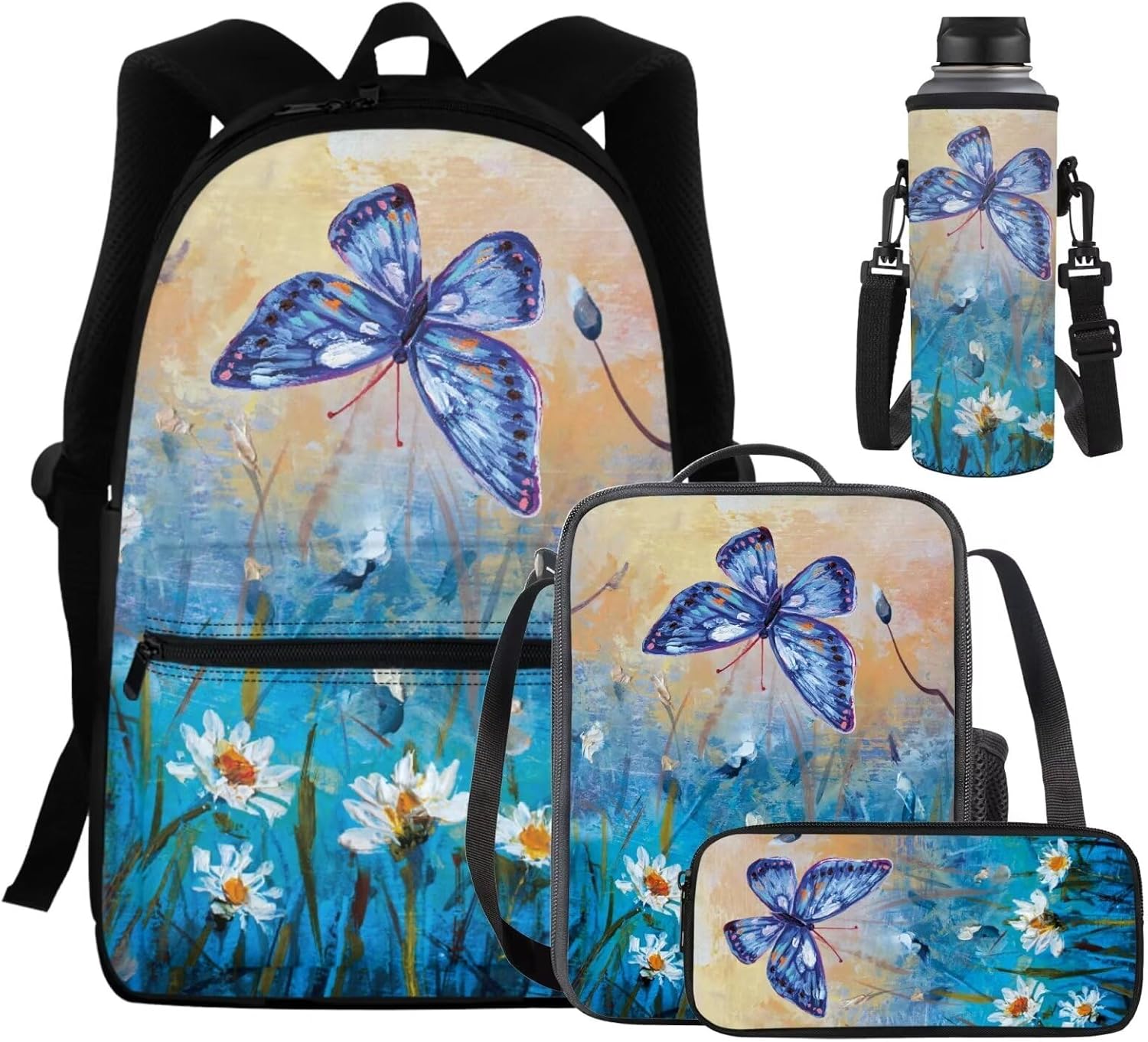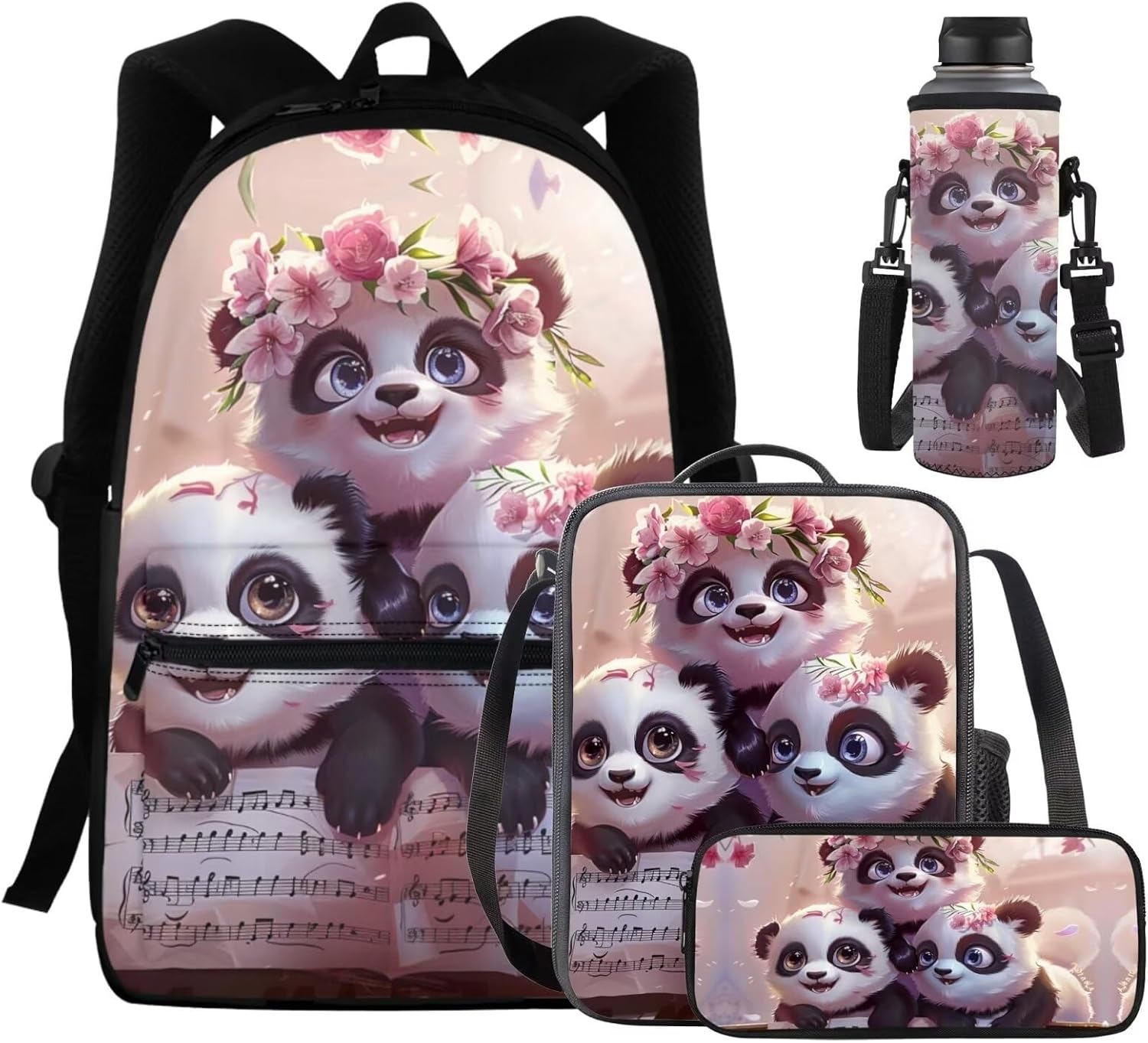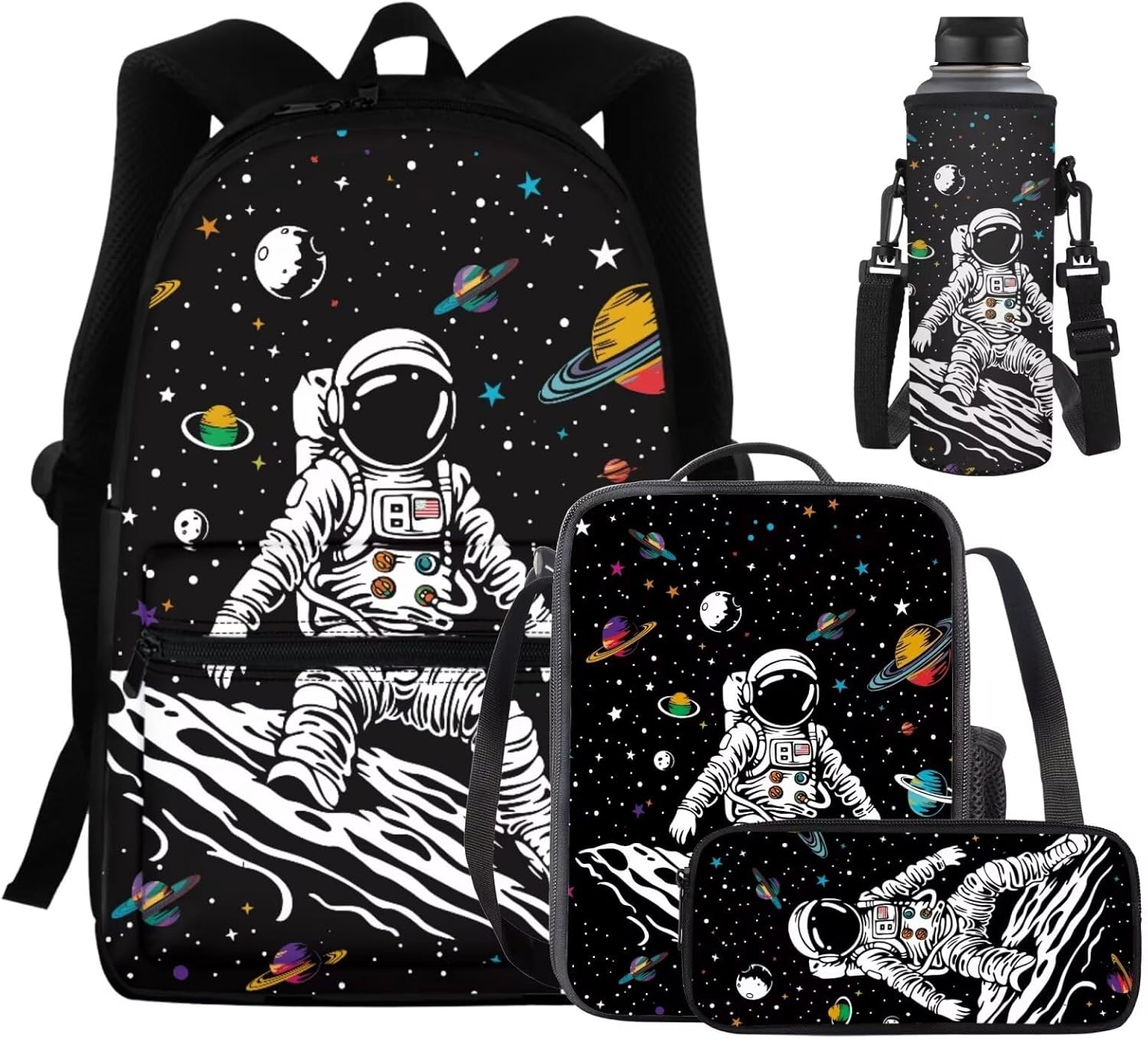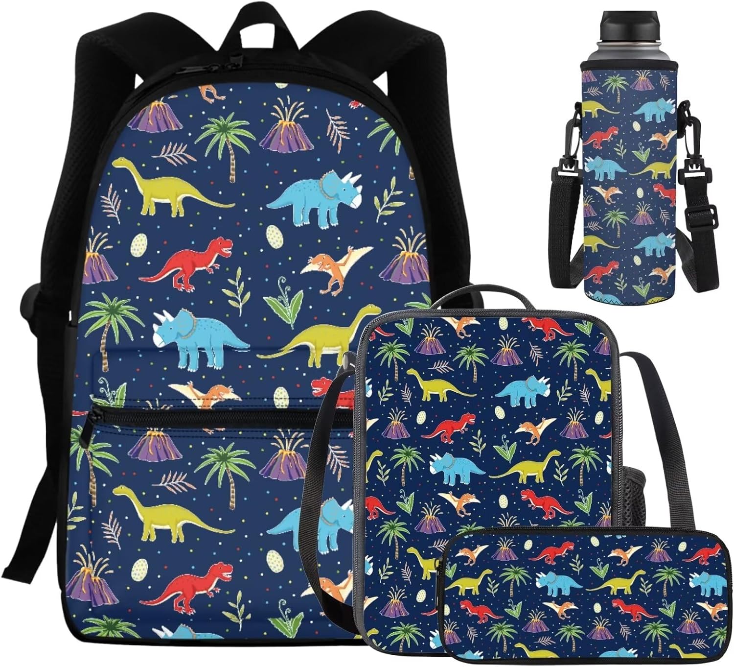 Uppodwarkid Fashion 4PCS Backpack Set Package Includes: 1 Backpack+1 Lunch Bag+1 Pencil Case+1 Water Bottle Holder Student Backpack: Our student backpack is designed with functionality and comfort in mind. It features multiple compartments and pockets to keep your belongings organized. The main compartment is spacious enough to hold textbooks, notebooks, and other essentials, while the padded laptop sleeve provides secure storage for your device. The adjustable shoulder straps and padded back panel ensure a comfortable fit, even when carrying heavy loads. Insulated Lunch Bag: Our lunch bag is perfect for keeping your meals fresh and delicious. The insulated interior helps maintain the temperature of your food, whether it's hot or cold. It has enough room to accommodate a variety of containers, snacks, and drinks. The sturdy handles and a detachable shoulder strap allow for easy carrying, and the durable construction ensures long-lasting use. Practical Pencil Case: Our pencil case is designed to keep your stationery organized and easily accessible. It features multiple compartments to hold pens, pencils, erasers, and other small items securely. The compact size makes it portable and convenient to carry in your backpack or separately. Water Bottle Sleeve: Our water bottle sleeve offers a convenient way to carry your favorite beverage. The stretchable mesh pocket securely holds most standard-sized water bottles, keeping them within reach. The adjustable strap allows for easy attachment to your backpack or carrying separately. Stay hydrated throughout the day, whether you're at school, work, or on the go. Invest in our 4-Piece Backpack Set and enjoy the convenience, organization, and durability it offers. From the spacious student backpack to the insulated lunch bag, practical pencil case, and water bottle sleeve, this set has everything you need to stay organized and prepared.