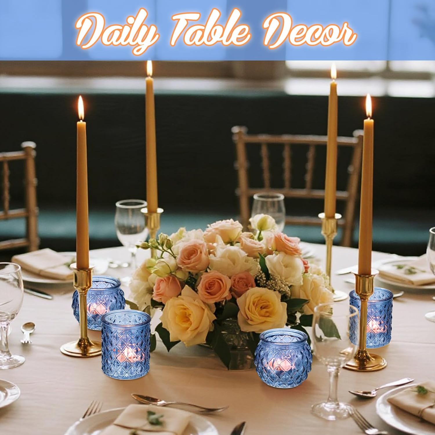 Features: You will get 48 pack blue votive candle holders in your package. These glass votive candle holders make a nice addition to every table setting, the glass reflects the light from the candle in such a pretty way, creating a warm and inviting ambiance that enhances the dining experience Whether it is a dining table or a shelf, whether it is a window sill or a mantel, they are the most eye-catching items. They are also suitable for various festival and party decor and gift giving, like Christmas, Thanksgiving, Halloween, Valentine's Day, Mother's Day, birthday parties, dinner rehearsals, baby shower, wedding shower Specifications: Color: Blue Package includes: 48 x Blue votive candle holders Notes: Manual measurement, please allow slight errors on size. The color may exist a slight difference due to different screen displays