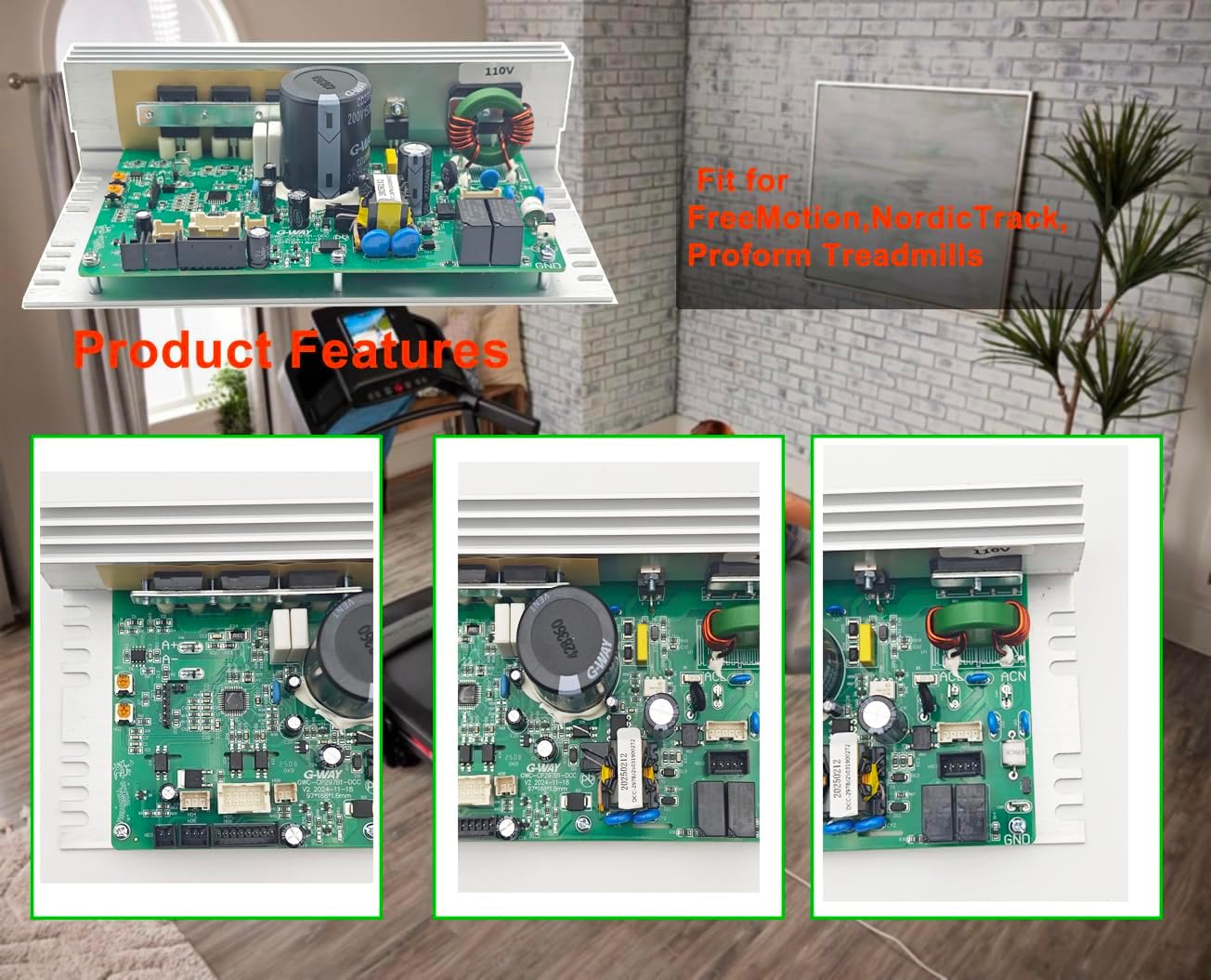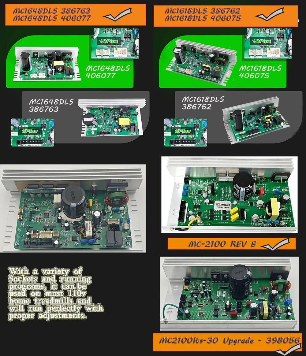 Packing List: 1 * Treadmill Control Board MotherboardFitment: Compatible with FreeMotion: 890 Interactive - SFTL19513.7Proform: CARBON T10 TREADMILL - PFTL90923.2, PFTL90923.3, PFTL90923.5, PFTL99920.1, PFTL99920.3; CARBON T7 TREADMILL - 23470.0, PFTL79720.0; PRO 2000 TREADMILL- PFTL12820.0, PFTL12820.3, PFTL12820.4, PFTL12820.7, PFTL12820.8, PFTL12820.9, PFTL13118.4, PFTL13118.5; PRO 900 - PFTL15820.0;NordicTrack: 1750-NTL14122.0, NTL14122.11, NTL14122.12, NTL14122.2, NTL14122.3, NTL14122.4, NTL14122.8, NTL14122.9, NTL17124.1, NTL17124.10, NTL17124.12, NTL17124.13, NTL17124.2, NTL17124.3, NTL17124.4, NTL17124.5, NTL17124.6, NTL17124.7, NTL17124.9;2450 - NTL17122.2, NTL19124.1, NTL19124.10, NTL19124.11, NTL19124.13, NTL19124.2, NTL19124.3, NTL19124.4, NTL19124.5, NTL19124.6, NTL19124.7, NTL19124.8, NTL19124.9; COMMERCIAL 2450 TREADMILL - NTL17122.0, NTL17122.14, NTL17122.18, NTL17122.19, NTL17122.5, NTL17122.6, NTL17123.5, NTL17123.6; COMMERCIAL LE TREADMILL - NTL13125.0; EXP 10I TREADMILL - NTL15421.0, NTL15421.3, NTL15421.4, NTL15421.7, NTL15421C.0, NTL18422.1, NTL18422.3; PRO 5000 - PFTL13820.0, PFTL13820.2, PFTL13820.3; T 7.5 S TREADMILL - NTL19819.3, NTL19819.4, NTL19819.6; T 9.5 S TREADMILL - NTL16119A.0, NTL16119A.2; T SERIES 8 TREADMILL - NTL10425.1, NTL10425.2; T SERIES 9 TREADMILL - NTL15725CW.0, NTL15725CW.1Replace Part Number: MC1648DLS-JST, ZE0824, 406077.
