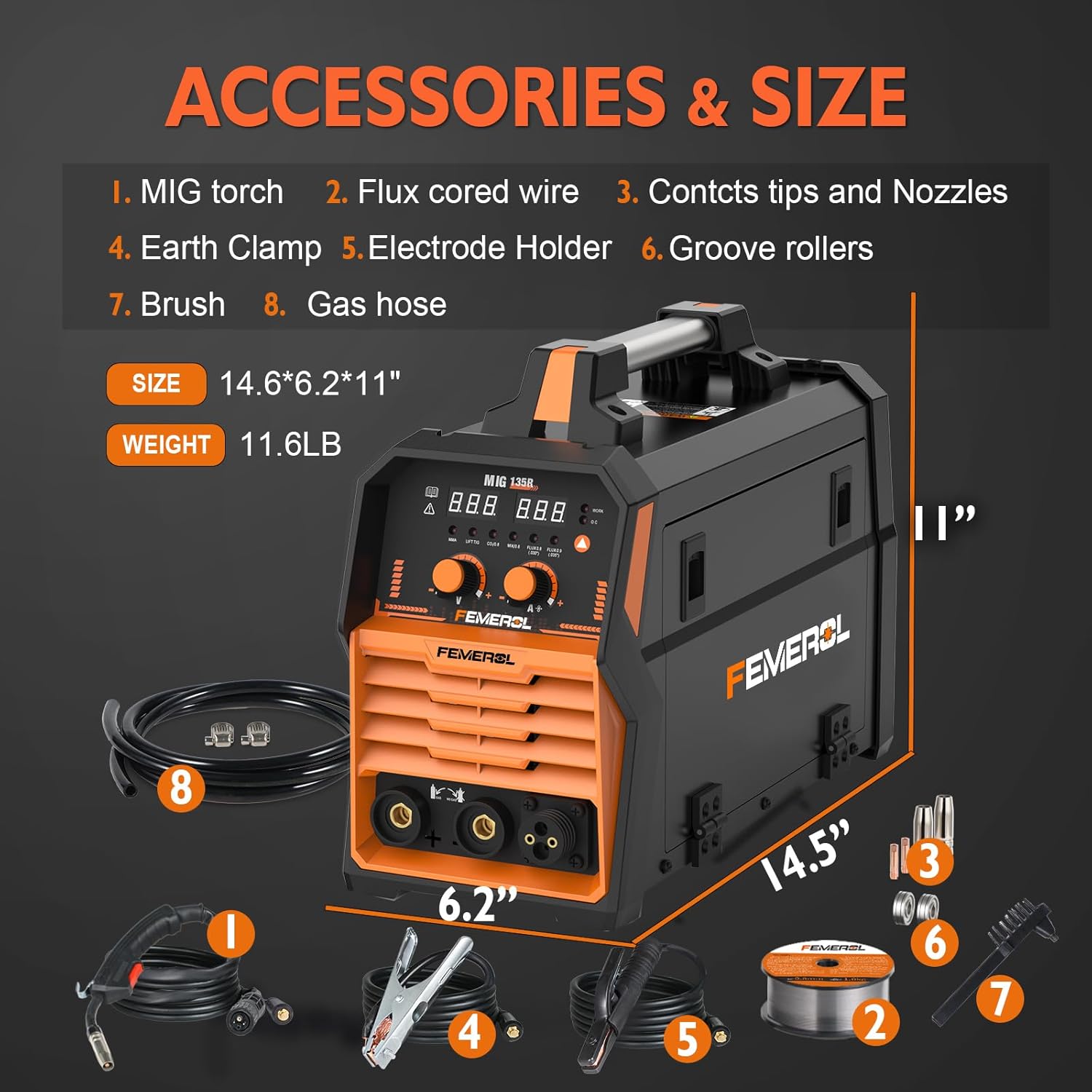 | Included Components | 130 MIG welder; MIG torch; Electrode holder;Ground clamp; Welding mask; Brush;0.5kg 0.8mm flux cored wire;Gloves,.030”/.035”contacts tips&nozzles. |