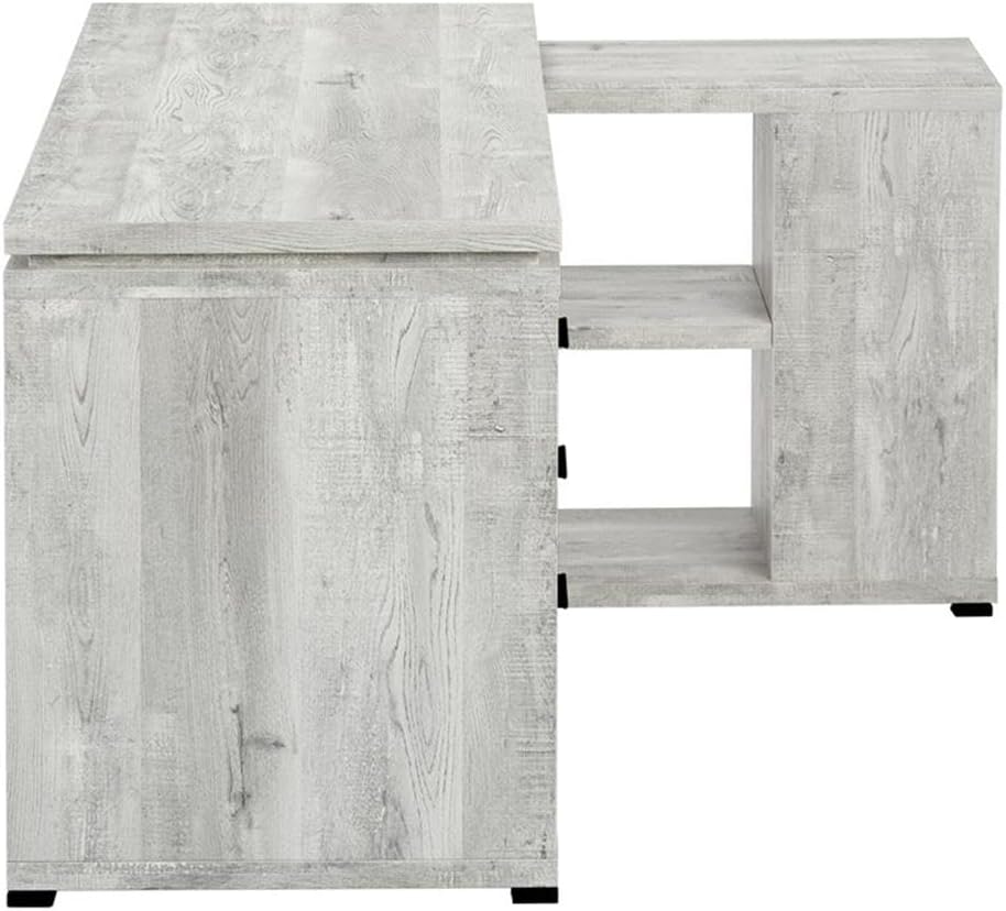 The trendy and industrial look of this L shaped computer desk will be the focal point in your modern home office. This simple and stylish desk features thick panels and clean lines in a modern gray reclaimed wood-look. The desk portion offers a spacious work surface that is great for doing paperwork or working on your computer. It also features 2 medium storage drawers and a convenient lateral file drawer on metal glides to help keep you organized. The secondary surface can be assembled on the left or right-hand side of the desk and offers additional workspace with adjustable shelves. The black handles and feet boldly accent this L-shaped desk making it a must-have for any home or office space.Features:- Finish: Gray- Material: Particle Board, Hollow-Core, Laminate, MDF- Contemporary style in a trendy gray reclaimed wood-look with black accents- The side shelf unit can be assembled on the left or right side of the desk- Adjustable shelves in the front and side- Abundant storage with 2 medium side drawers and 1 convenient drawer for standard or legal size folders- Finished on all sidesSpecifications:- Product Dimensions: 29" H x 60" W x 47.25" D- Product Weight: 143 lbs