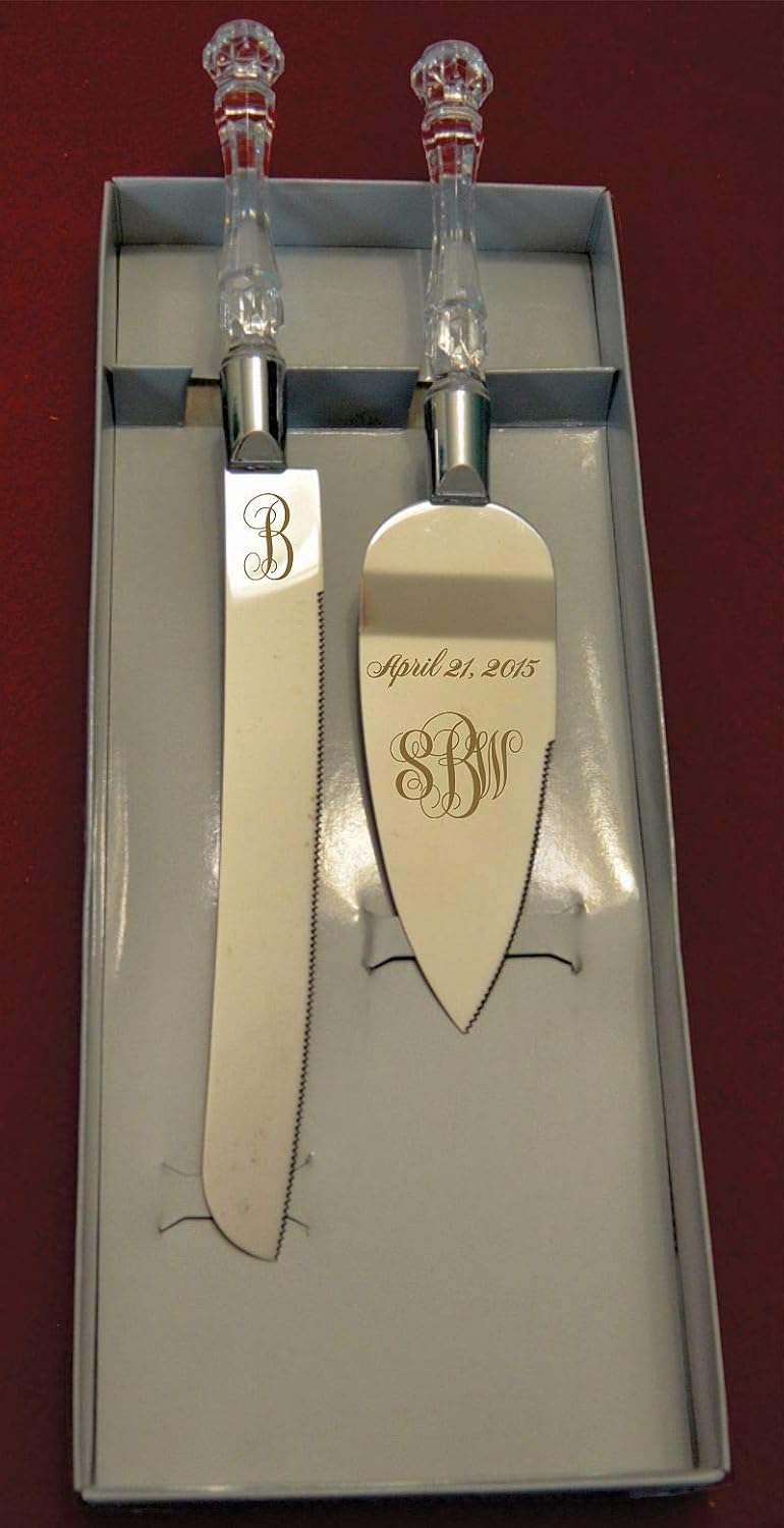 Cake Knife is 13" long, The Server is 10.5" x 2" This is the popular Faux crystal handle set that I have added the etched Monogram theme that matches my Topper, flutes and plates Check out my other items to see matching items. ONCE All work is done by Aaron from Aaron’s Etchings DIsclaimer : This is not a Heirloom type Server set. This set is the most popular server set for weddings or retirement type celebration. That is all it is meant to be although the set I used for my wedding went into the kitchen draw and is still being used after server years. The handle is acrylic "Fake Crystal" the blades are real stainless steel and they are very sharp. This is the same set sold at a Nation Craft store in the wedding section for around $10, I take them and do about $20 worth of labor on them. No fast money here I work hard to deliver this product to you at a fare price. The servers do have light scratches that can be seen under inspection and it will get more as it is used, it is the nature of polished stainless steel. It all blends in after a while but the etching will always be there, scrub, dishwasher, abuse My etching stays where I put it. I repeat Not a Heirloom but worth more than I am charging. I do have a Waterford set that is $360.00 which is a Heirloom set if that is what your looking for. All months over 5 letters will be abbreviated unless requested otherwise "except for items showing numbers only" . "Looks much better on display"