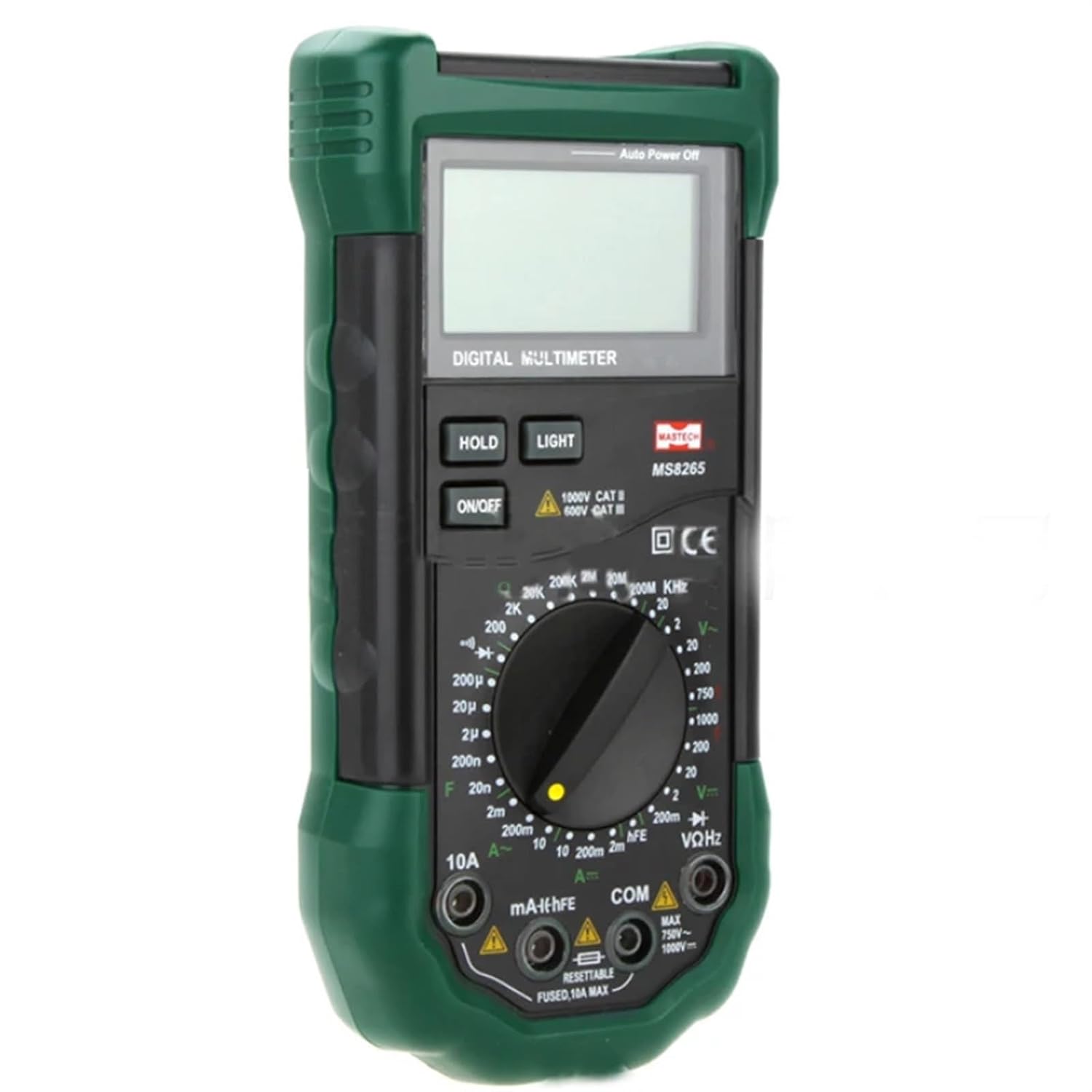Multi TestersMS8265 Manual Range Digital Multimeter for AC/DC Voltage Current Test with Ohm Capacitance Frequency MeasurementFeatures:Large 20000 Counts DisplayMeasures AC/DC Voltage and Current, Resistance, Capacitance, FrequencySound and Light warning for incorrectly inserting the input plugsTransistor (hFE) Check, Diode and Continuity TestData Hold and Display Back LightSafety Rating up to .II 1000V / .III 600VSpecifications: Voltage: 200mV+/-(0.05%+5digit)2V/20V/200V+/-(0.1%+5 digit)1000V+/-(0.15%+5 digit)AC Voltage(50~60Hz):2V+/-(0.5%+15 Digit)20V/200V +/-(0.8%+15 digit)750V +/-(1.0%+15 digit)AC Voltage(40~400Hz):2V+/-(1%+15 Digit)20V/200V+/-(1%+50 digit)750V +/-(1.2%+50 digit)10A +/-(2.0%+20 digit)AC Current:2mA +/-(0.8%+20 digit)200mA +/-(1.2%+20 digit)10A+/-(2.5%+50 digit)Resistance: 200+/-(0.5%+10 digit)2k/20k/200k/2M/20M+/-(0.5%+5digit)200M+/-(0.5%+20 digit)Frequency: Range: 20kHz ,Resolution: 1 HzCapacitance: 20nF/200nF/2.0uF/20.0uF/200.0uF+/-(4.0%+20 digit)Diode test:YesContinuity buzzer test:YeshFE Test:YesGeneral Specifications:Dimension: 20cm*15cm*20cmProduct Weight: 380gPower Supply: 1 * 9V 6F22(not included)Package Size: 21 * 12.5 * 6cm / 8.2 * 5 * 2.3inPackage Weight: 551g / 1.2lb==========Operating Mode : ManualMeasuring Capacitance Range : 20/200nF/2.0/20.0/200.0uFOperating Temperature : 0 - 50 DIY Supplies : ELECTRICALMeasuring Resistance Range : 200/2/20/200K/2/20/200M ohmModel Number : MS8265Measuring Inductance Range : Refer to SPECDimensions : 20cm*15cm*20cm Current : 2mA/200mA/10AAC Current : 2mA/200mA/10AAC Voltage : 2V/20V/200V/750V Voltage : 200mV/2V/20V/200V/1000VDisplay Type : Digital display