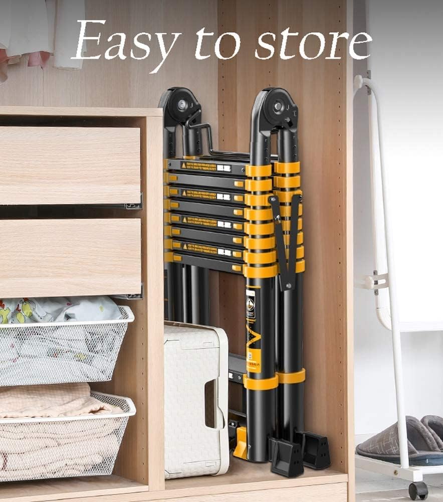 Multi-Purpose Telescoping Ladder,Portable Heavy Duty Aluminum Ladder Building Maintenance DIY Extension Ladder Please Note: Do Not Place Your Hands or Fingers between the Rung When Closing the Ladder Note: 1. Because of the Manual Measurement 1-3Cm Size Error Take Physical Size Must Prevail 2. There is a Slight Difference between the Image and the Actual Element Caused by the Brightness 3. Incorrect Maintenance Mode Will Seriously Affect the Appearance of the Product and the Useful Life 4. If you have any questions about tAhe product,please contact us,due to the international time difference,we will reply you within 24 hours,thank you for your understanding