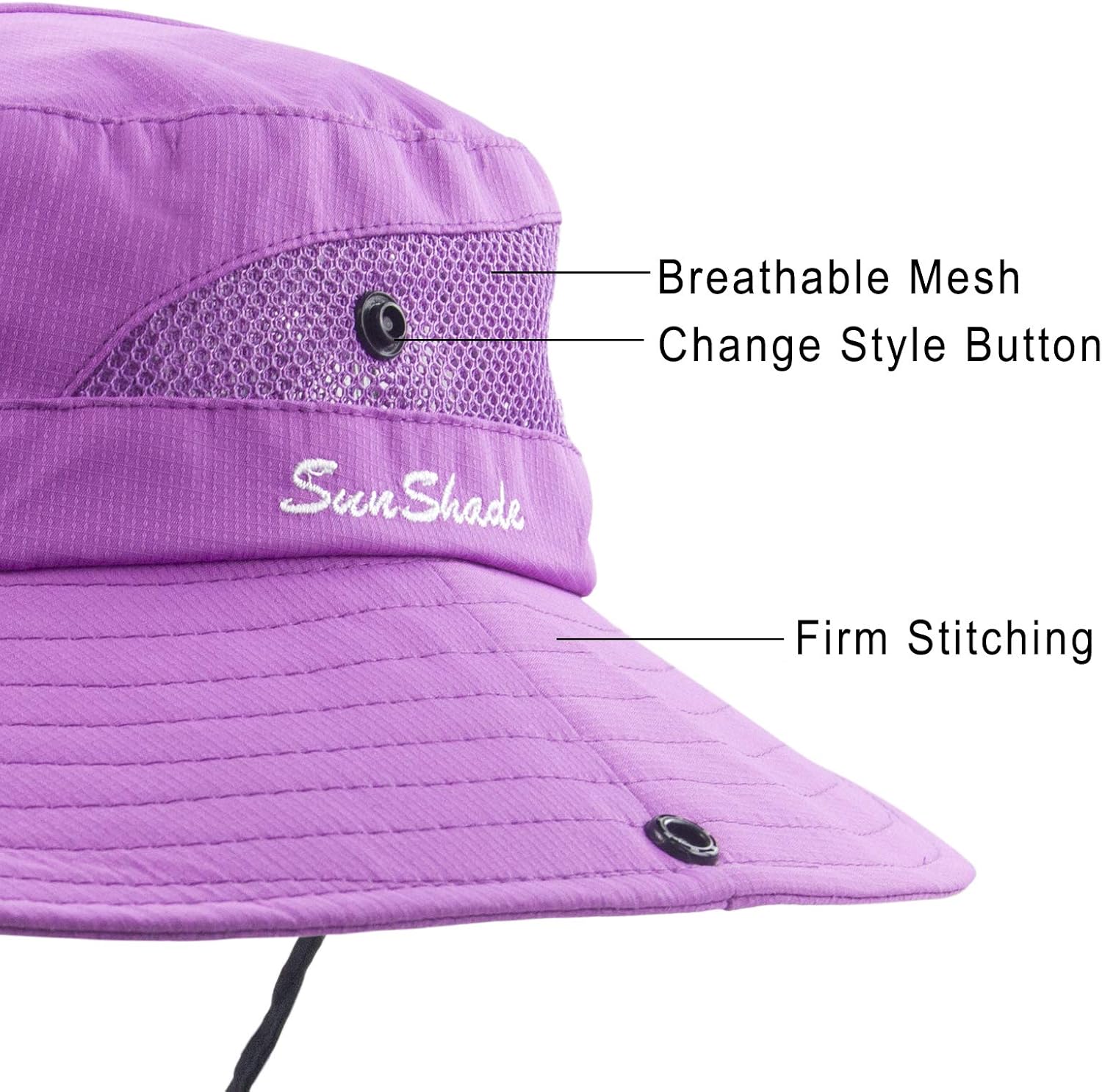 SIZE & MATERIAL Hat Circumference: 21”-23”Hat Height: 4.33 inchBrim Length: 3.35 inchChin Drawstring Length:12.99 inchOne size fits most women. High quality polyester material. Soft, windproof, breathable, quick-drying, ultra-light. FUNCTIONAL AND VERSATILE This sun bucket hat with a wide brim keeps the sun from your face and neck and offers great protection from the damaging rays. Also cap comes with adjustable draw string to keep the hat from flying off in the wind. The hat is extremely light and comes with mesh side panel and sweat band to keep you cool during long summer days. The visor hat is adjustable on the back. It is open in the back, which means it will fit with a pony tail. The buttons beside the hat that can be buckled and become western cowboys immediately. The sun hat still keeps in good shape after being folded up and down so many times.The fishing hat can be folded, which is very convenient to put it in your bag, lightweight and easy to carry. Designed For Outdoors Casual style bucket hats are perfect for people who are engaged in outdoor recreation such as fishing, camping, hiking, gardening, traveling, boating, hunting, safari, beach, pool or any other outdoor sport activity.