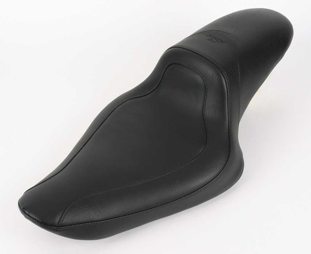 The Mustang 76145 Fastback one-piece seat offers super clean, custom style with a high-rising wall that offers excellent back support. Cut low to place the rider slightly lower and further back compared to stock. The tapered passenger section provides a streamlined look, but still offers a reasonable degree of passenger comfort. Includes (1) Fastback one-piece seat in black; suggested for installation (not included): phillips screwdriver and retained stock fender screw. The Mustang 76145 Fastback one-piece seat is compatible with Harley-Davidson models: Sportster '04-'19 with 2. 1 or 3. 3 gallon tank; measures 11" front width and 6" rear width.