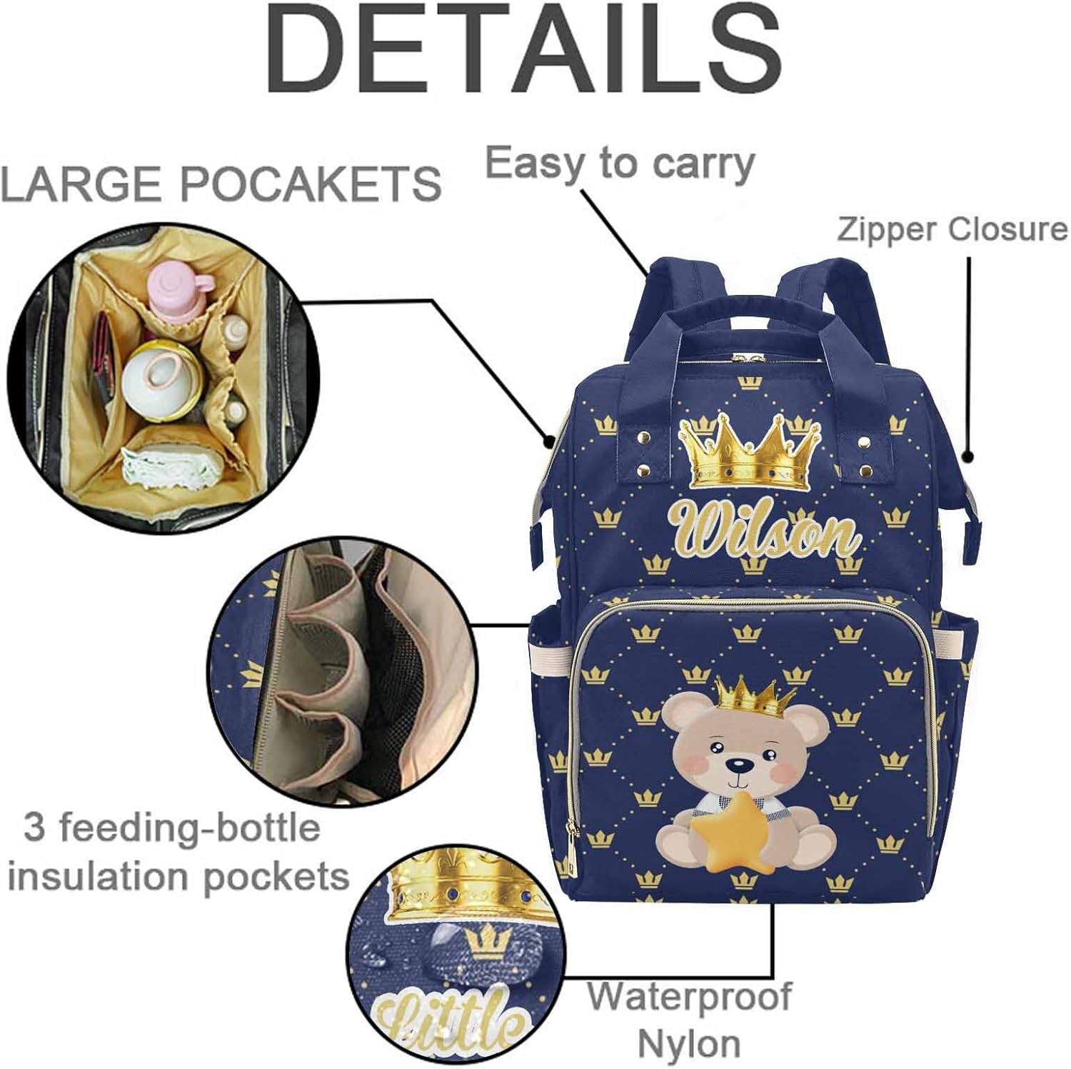 Diaper Bag Backpack Personalized with Name for Girl Boy Mom & Dad, you can personalize the name what you need anytime. Nylon Material: Oxford and nylon fabric, makes the mom dad diaper bag durable. Baby bag with smooth zipper, sturdy inner lining, delicate reinforced stitches.Large Capacity: Custom Name diaper backpack with a main compartment and some different separate pockets inside, which can store different things, daily necessities. Item size: 10.8"(L) x 6.9"(W) x 15.75"(H).Multi-function Design: Front compartment includes 3 insulated pockets and one mesh compartment, the milk bottles can be placed in the insulated pockets. The other big compartment inside designed by absolute 4 pockets and one zipper pocket, so that you could put different things and keep them organized. Diaper bag also with 2 side pockets.Adjustable Straps: Make you more comfortable and stable while you carrying the personalized name diaper bag backpack.Waterproof: The Water resistant outer material of personalized diaper bag to protect your daily goods and the inner lining can be wipeable.