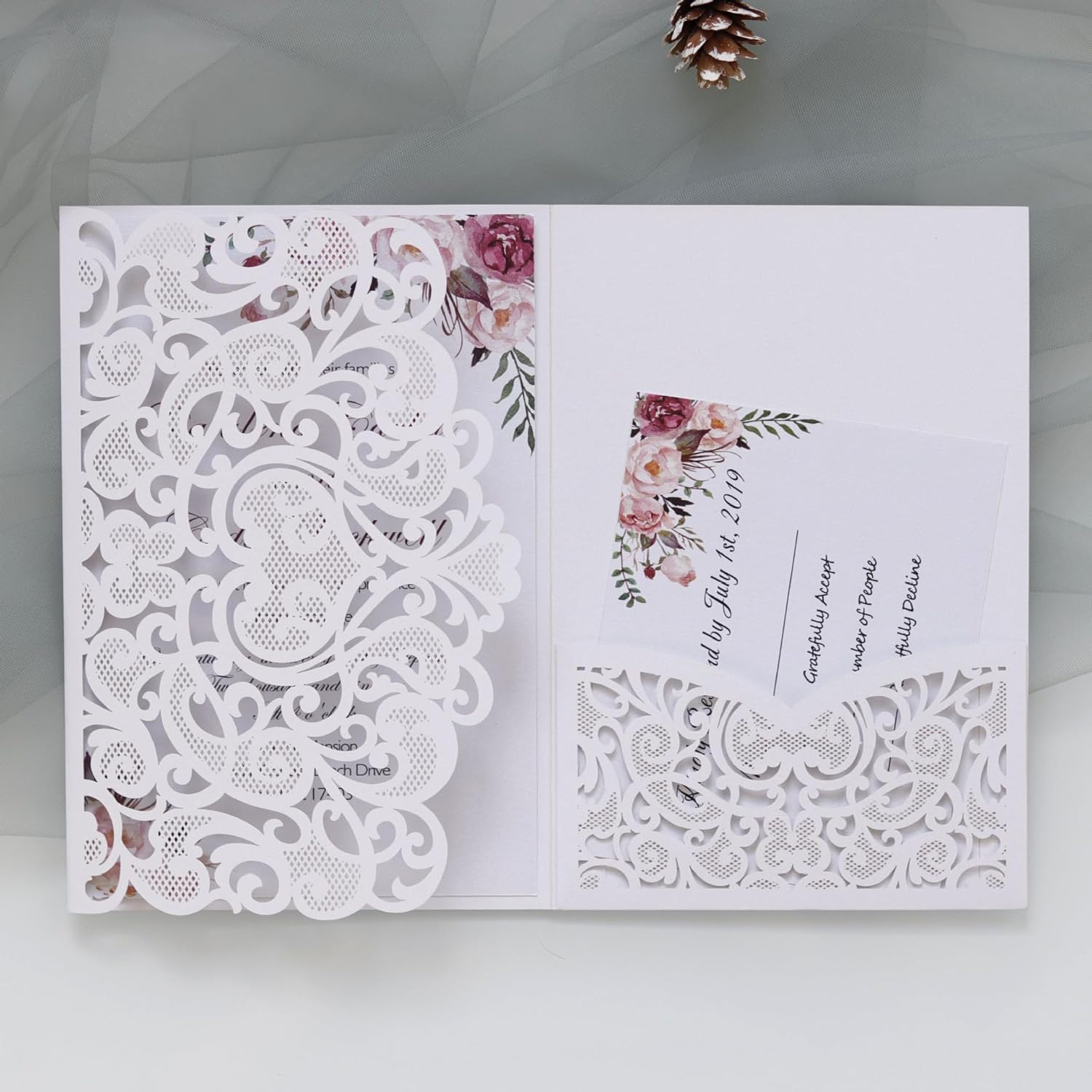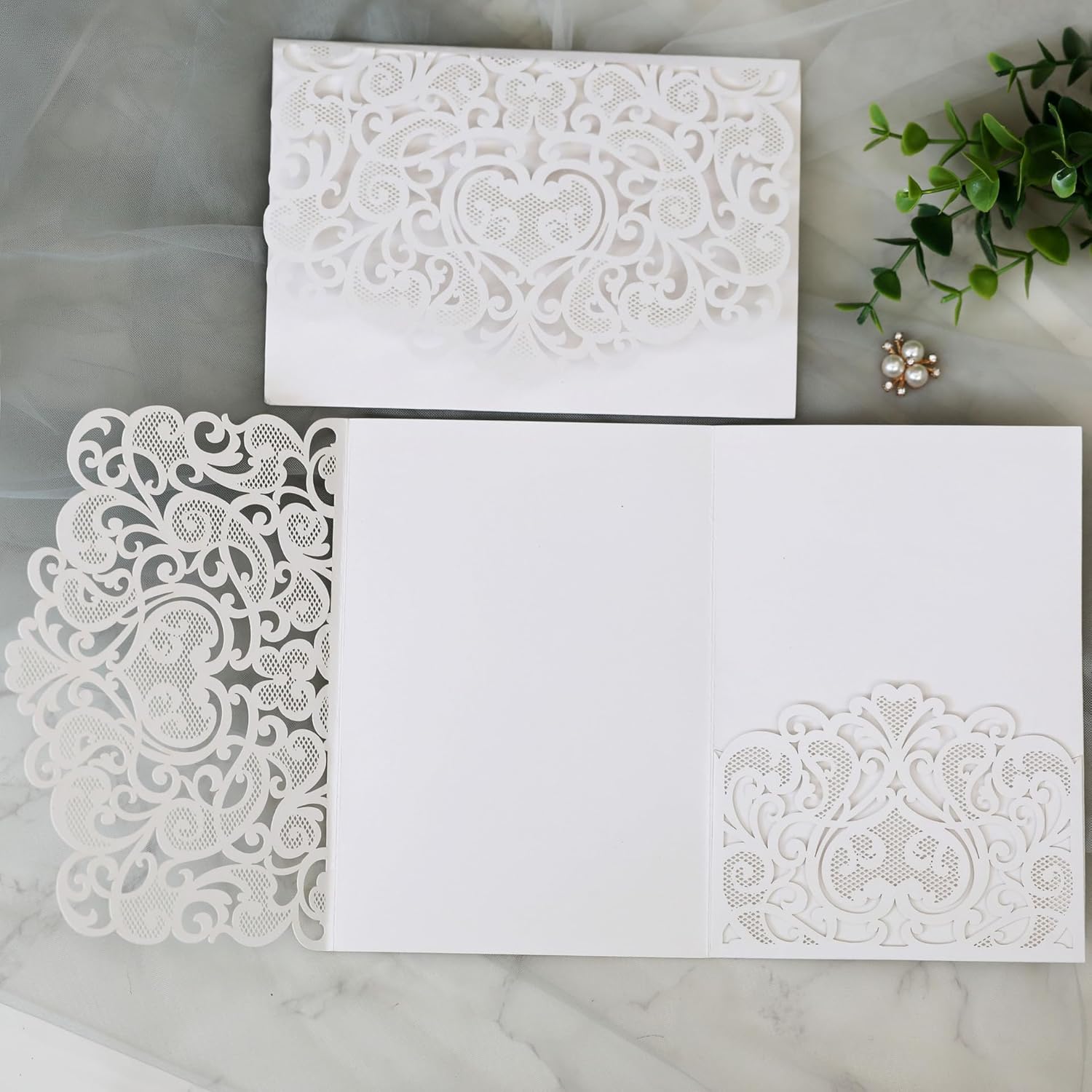 50 Sets Tri fold Love Hollow Laser cut Pocket Wedding Invite Invitation Card Jacket for Party Birthday Quinceañera Invite 4.92 by 7 inches