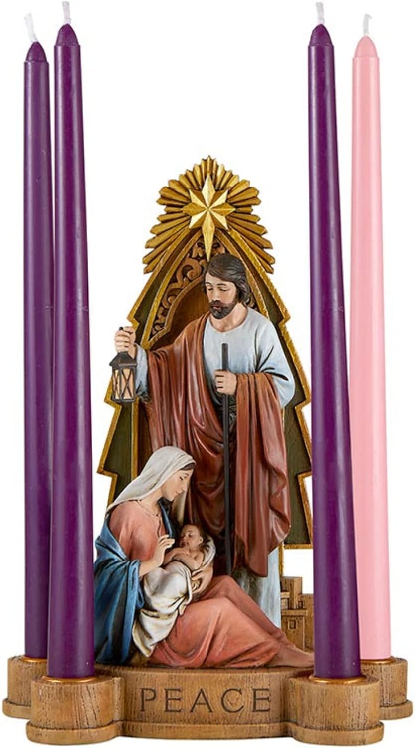 ADVENT this Christmas season celebrate Advent with this beautifully detailed candleholder featuring the holy family underneath the Nativity Star. SIZE candleholder sits 10.75 inches tall. The base measures 7.75 x 5.75 inches. This large candle holder is the perfect size for a centerpiece on your table or a large mantle. MATERIAL this full color, detailed Christmas figurine is made of a resin material featuring 5 candle holders. Advent candles are not included. SCRIPTURE the back of this figurine is engraved with the words: The Angel Said To Them, "I Bring You Good News That WIll Cause Great Joy For All." Luke 2:10 CHRISTMAS decoration has a beautiful rendition of the Nativity and is the perfect centerpiece for any home. Candleholder comes in a gift box for easy gift giving!