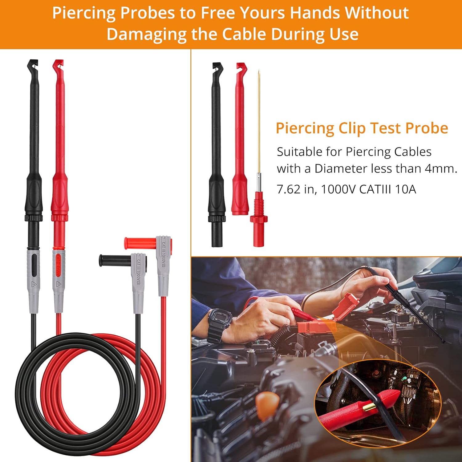 • 【Easy to Use】 Suitable for piercing cables with different diameter. Piercing probes is no need to strip or damage the cable during use that can puncture and clamp the cables, freeing your hands