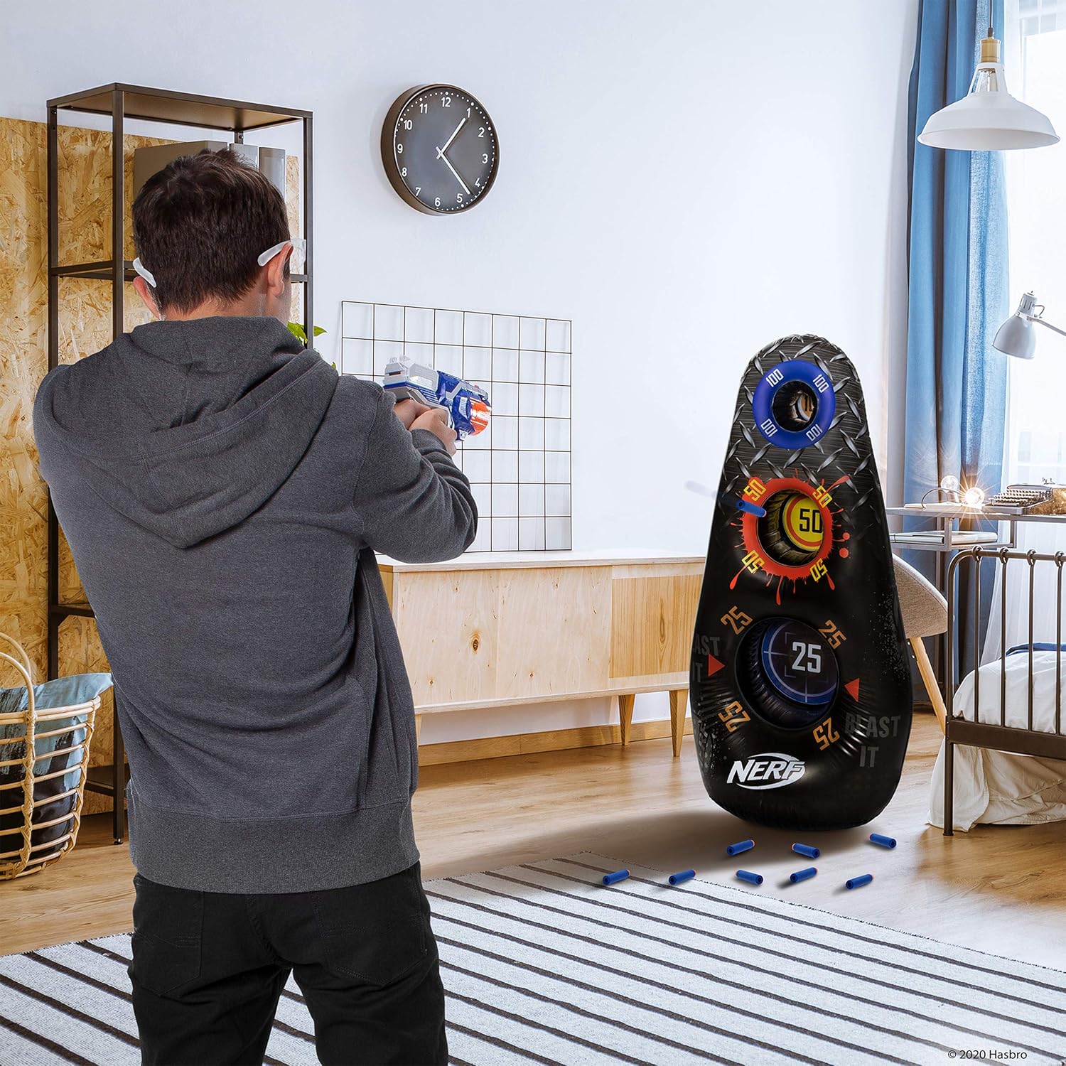 Perfect your aim everywhere with the Nerf Inflatable Target. This officially licensed Nerf toy is perfect for practicing your aiming skills at home, the park, or almost anywhere. Challenge your friends and score high with the 25, 50, and 100 point scores. This 4-foot target fits almost everywhere, making any area a Nerf arena. It’s Nerf or Nothin’.