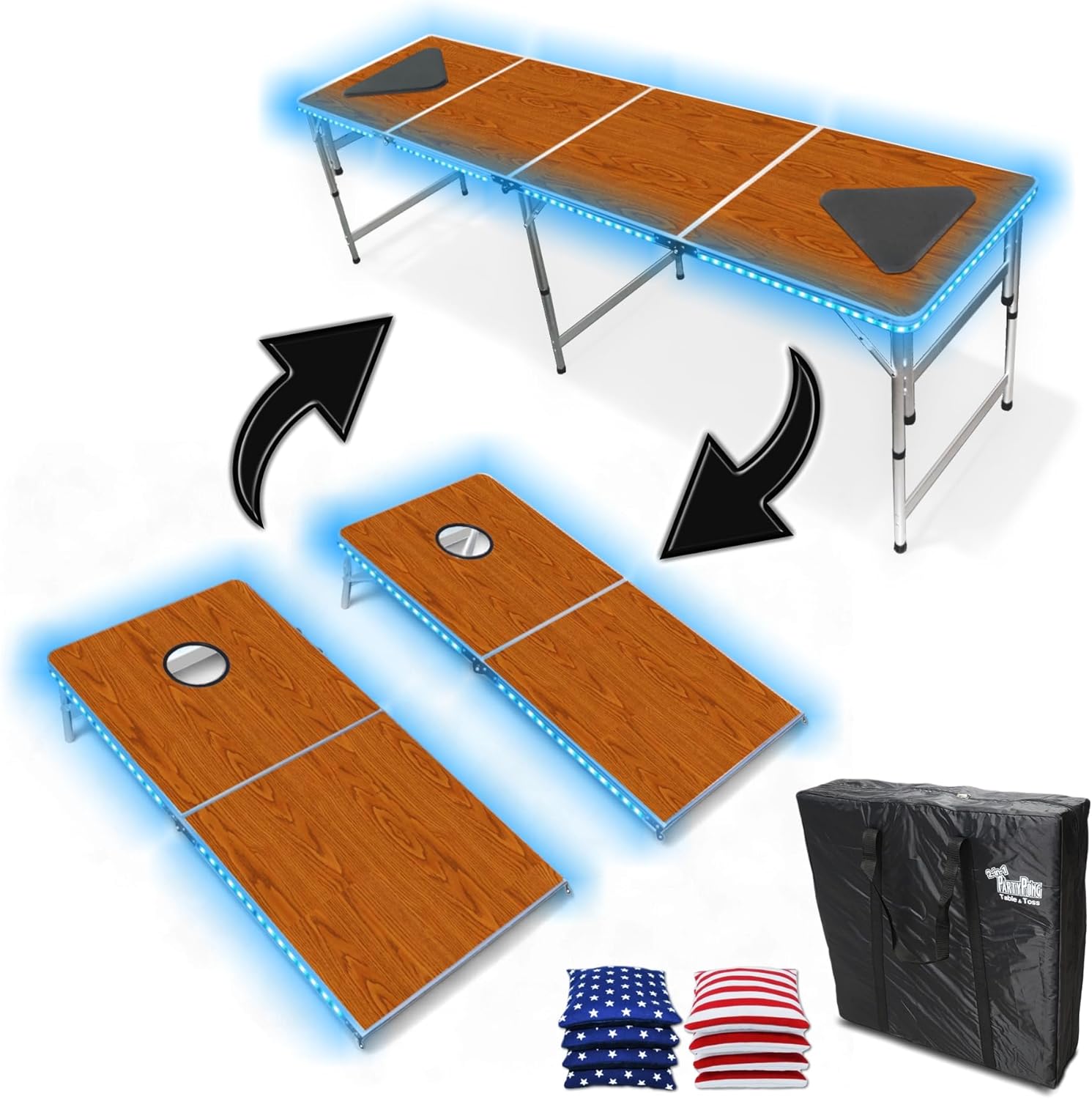 • INCLUDES: (2) 4x2 ft cornhole boards that convert into (1) 8x2 ft Party Pong table, LED Lights, (8) all-weather throwing bags, (2) throwing bag storage pouches, (2) plastic triangles to cover cornhole holes for perfect Party Pong cup setup, (6) Party Pong balls, (2) table connector screws, and (1) nylon carrying/storage case with shoulder straps. Each 2-in-1 includes everything you need for a complete game experience, whether you're playing cornhole or Party Pong!