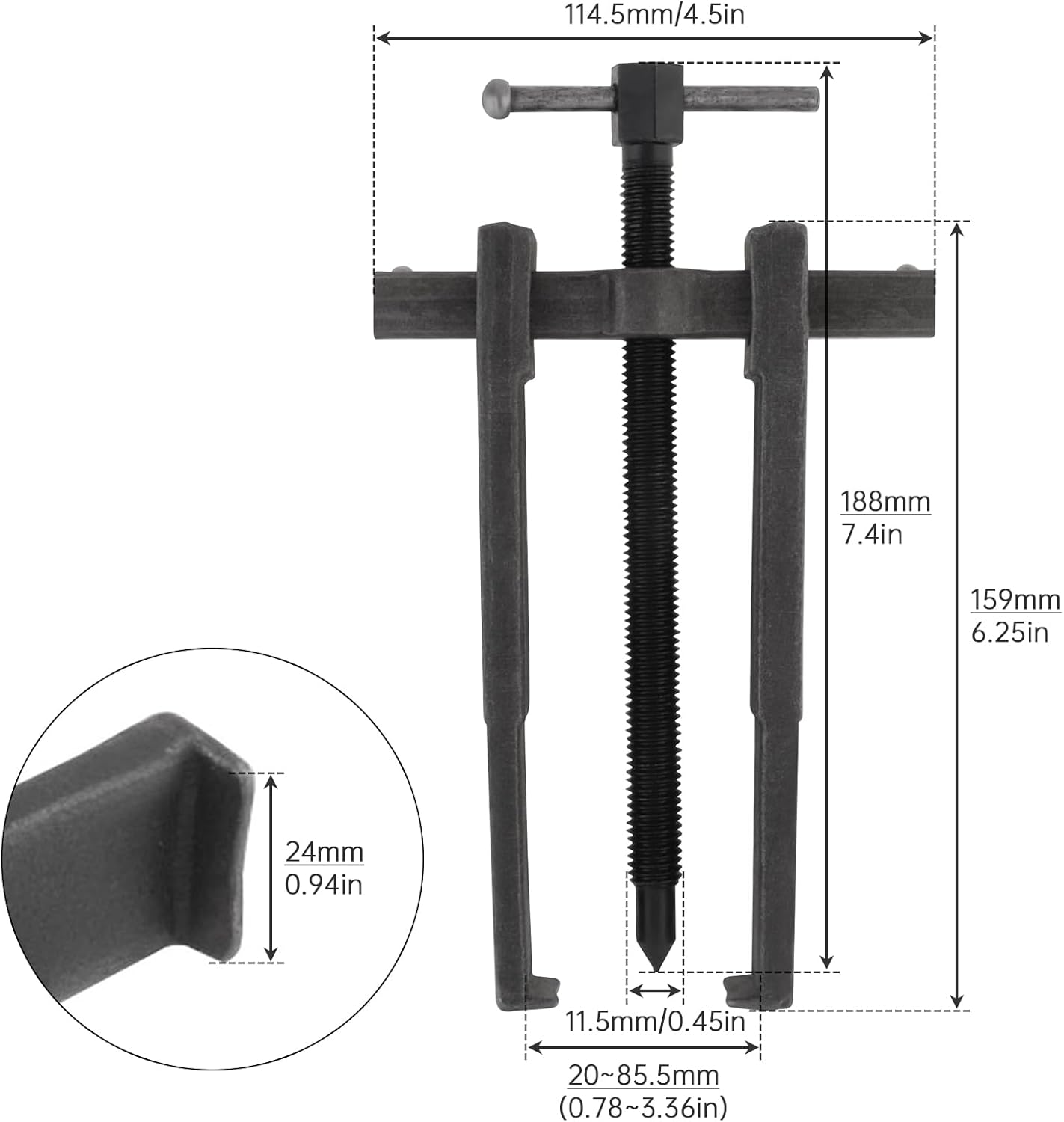 • √ Adjustable - 2 jaw 8 inch bearing Remover can adjust the clamping depth. Adjustable Diameter 30-80mm. (Internal pull diameter: 20-85.5mm; External pull diameter: 38-94mm) Reversible claw legs make it suitable for use as an internal or external bearing puller. The reasonable design of the claw will not fall off when force is applied.