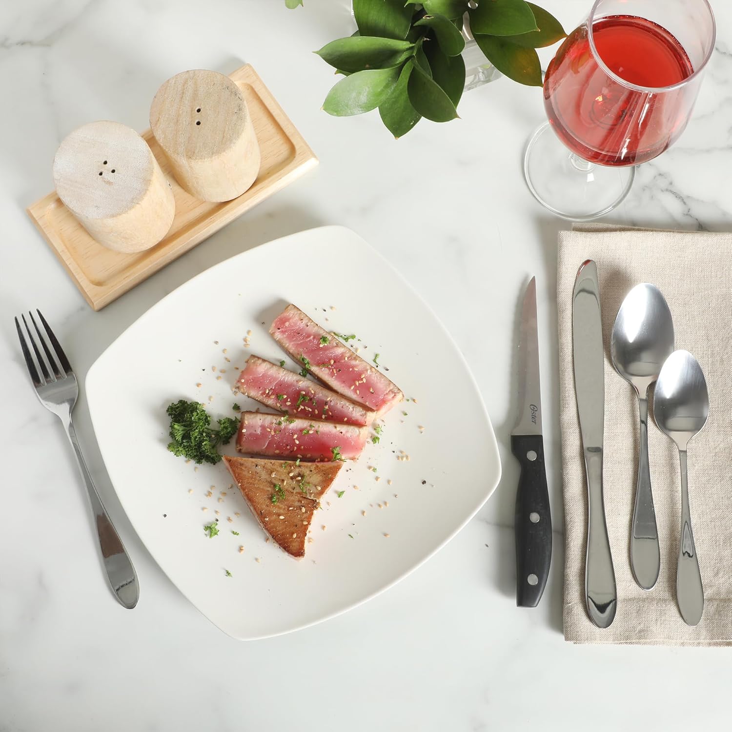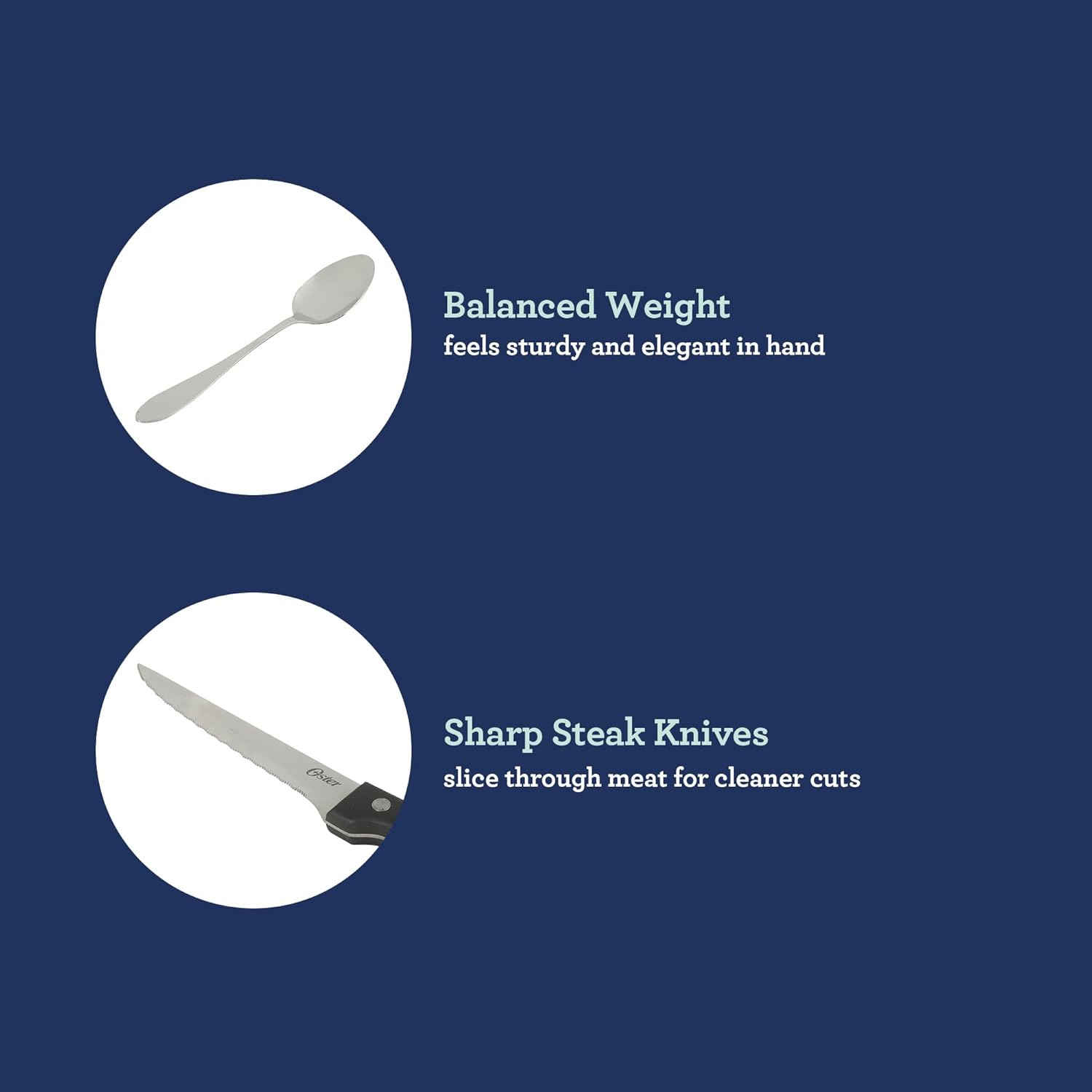Well-planned place settings shine with the sleek accent of beautifully chosen silverware.The Oster™ Silvermist Stainless Steel Flatware Set brings timeless style and everyday durability to the table, with a mirror-polished finish and balanced weight that feel as elegant as they look. Suitable for service for four, this set includes four extra steak knives to handle main courses and proteins, delighting guests at every meal. Their sharp blades slice cleanly without crushing and provide control with every cut. Dishwasher safe. Get Creative in the Kitchen with Oster™. A trusted homewares brand for almost 100 years, Oster™ has a wide selection of durable and versatile products for today's home cooking and entertaining environment. Simple quality cookware, cutlery, food prep gadgets, and more provide dependability and functionality to meet everyday kitchen needs. From family mealtimes to weekend celebrations, Oster™ is ready to help and serve generations of home cooks in the US, Latin America, and beyond.