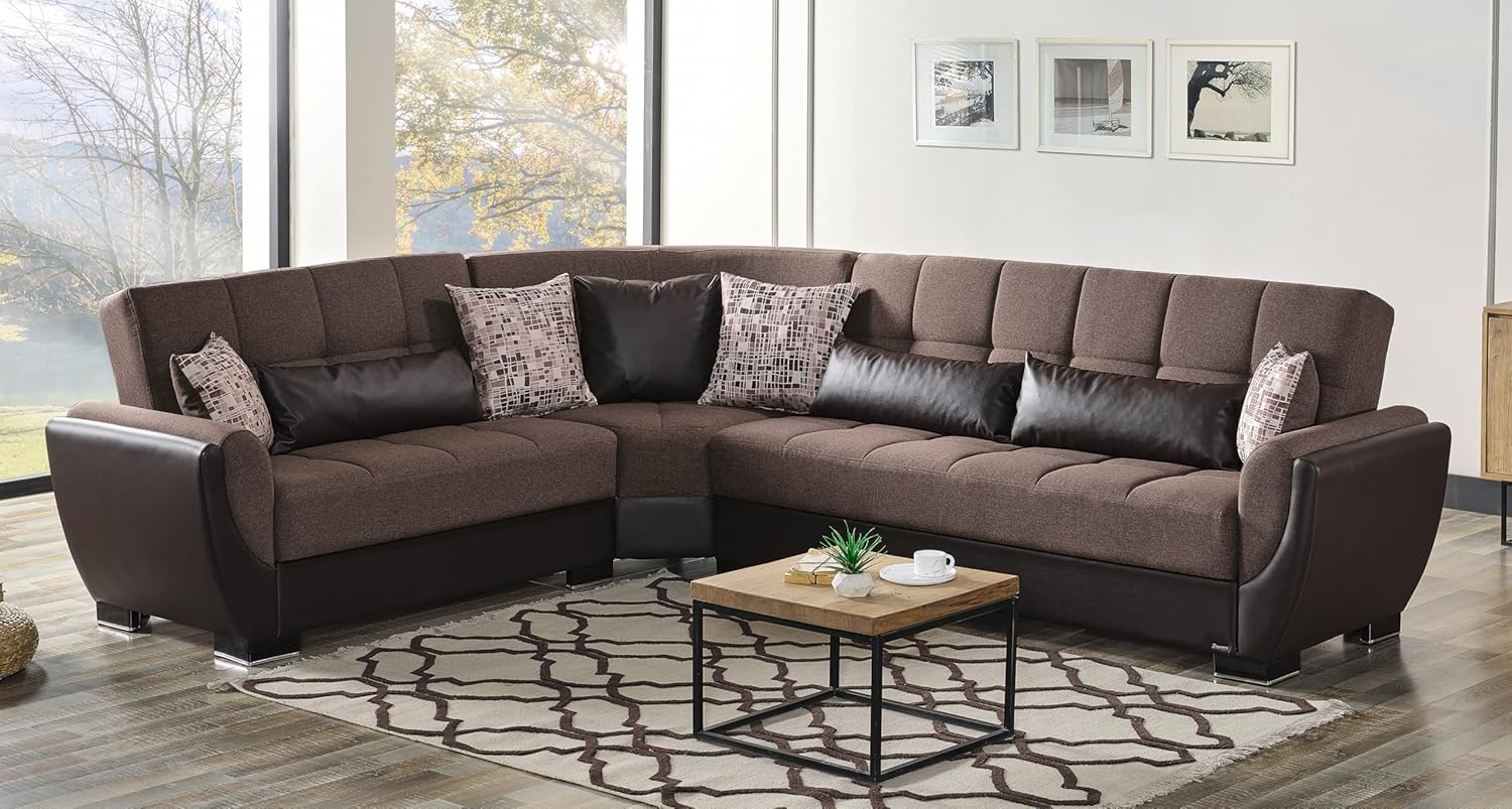 The Ottomanson Summit Collection Convertible Sectional Sofa combines traditional decorative styling with multifunctional furniture versatility. Designed to provide spacious seating, lounging, occasional sleeping functionality, and storage convenience, this sectional delivers practical comfort while maintaining timeless decorative appeal.The sectional layout combines a convertible sofa, convertible loveseat, and wedge corner seat to create expanded seating capacity while maintaining a cohesive corner sectional design. The wedge seat creates a smooth seating transition between sections and provides comfortable corner seating while remaining stationary for structural support.The sofa and loveseat sections feature click-clack sit-to-sleep conversion mechanisms that transition seating surfaces from upright seating into flat lounge or sleep surfaces. This design provides flexible relaxation and guest-use sleeping space across the convertible seating sections. This design converts between upright seating and flat sleeping positions and does not offer intermediate reclining angles.Unlike pull-out mattress sectional sleepers, this convertible sectional creates a lay-flat lounge or sleep surface through backrest conversion rather than internal mattress extension. This design helps maintain seating comfort while providing versatile functionality for occasional overnight use and relaxation.Hidden storage compartments are integrated into select seating sections and provide discreet and convenient space to store blankets, pillows, bedding, or household essentials. The wedge corner seat does not contain storage and serves as a stationary seating component designed to provide structural balance and expanded seating capacity.Designed with intentionally firm seating support, this sectional provides structured comfort that helps maintain cushion shape and long-term durability. The supportive seating feel helps reduce excessive sagging and provides stable comfort for sitting, lounging, and occasional sleeping. Customers who prefer plush or deep sink-in seating may find this sectional firmer than expected, while customers seeking supportive seating often prefer this construction for everyday use.The upholstery features decorative traditional styling with elegant pattern detailing that complements classic, transitional, and formal living room décor. Matching accent pillows shown in product imagery are included to help complete the coordinated furniture presentation.Assembly is required and power tools are necessary for proper installation. Because of the sectional size and conversion components, two-person handling is strongly recommended during assembly and placement to help protect upholstery materials and structural components.The Summit Collection is designed as a coordinated modular seating system. Customers can expand or customize their living room layout by adding matching Summit Collection sofa, loveseat, or chair pieces to create expanded seating arrangements. Additional furniture pieces are sold separately.The Summit Collection Convertible Sectional is designed to function as family seating, lounge relaxation furniture, guest-use sleep seating, or entertainment seating, delivering multifunctional comfort, structured support, and timeless traditional design.