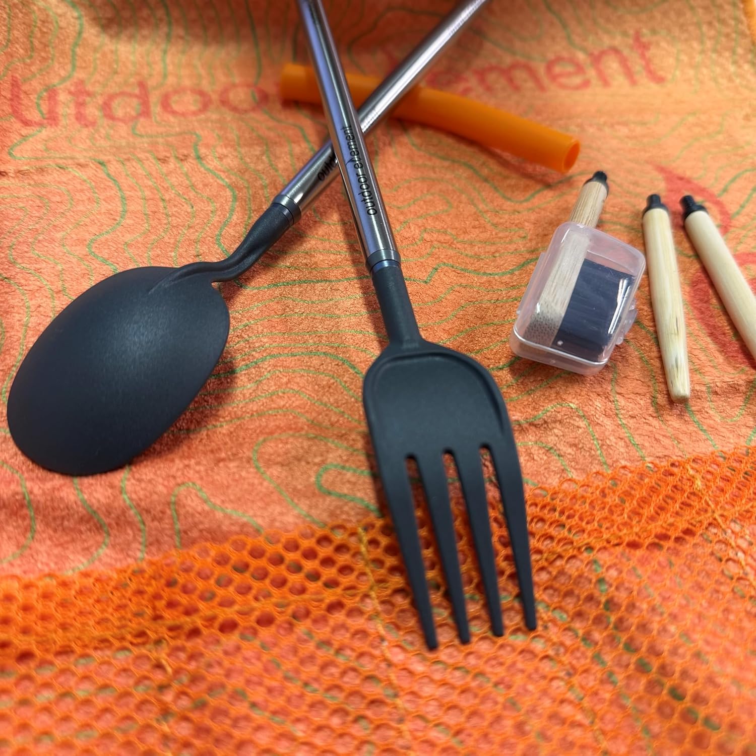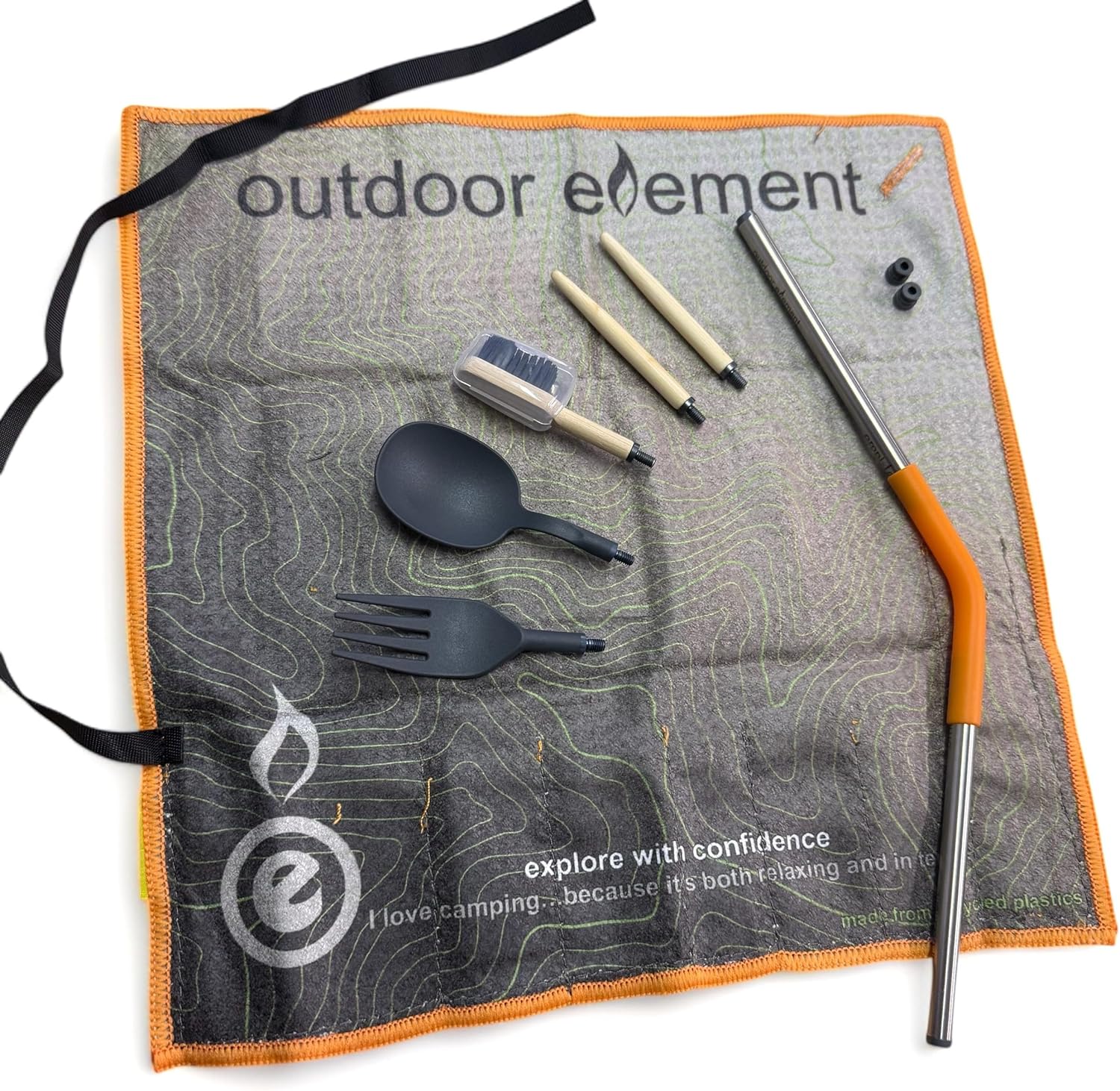 The Omni-Tensil by Outdoor Element is the ultimate lightweight, portable utensil set designed for outdoor enthusiasts who want an eco-conscious, versatile, and space-saving solution for eating on the go. This all-in-one kit includes interchangeable spoon, fork, chopsticks, and toothbrush heads that securely attach to stainless steel tube handles, which double as a mini fire bellows when connected with the included silicone sleeve. Built for adventure, the interchangeable heads are made of hard BPA-Free Glass-reinforced Nylon (sturdy in high heat and resistant to abrasion and wear) and sustainable bamboo. The microfiber pouch, made from recycled plastics, keeps everything organized while doubling as a quick-dry washcloth. If you’re backpacking, overlanding, or just looking for a smarter way to pack utensils, Omni-Tensil is a compact, durable, and nature-friendly solution. Includes a dad joke on the towel because every meal should come with a side of humor. Our products are thoughtfully designed in Colorado, USA, and manufactured in China. We take pride in maintaining high-quality standards and ensuring each product meets our customers’ expectations. In the near future, production will be moved to Vietnam, while continuing to be designed in Colorado.