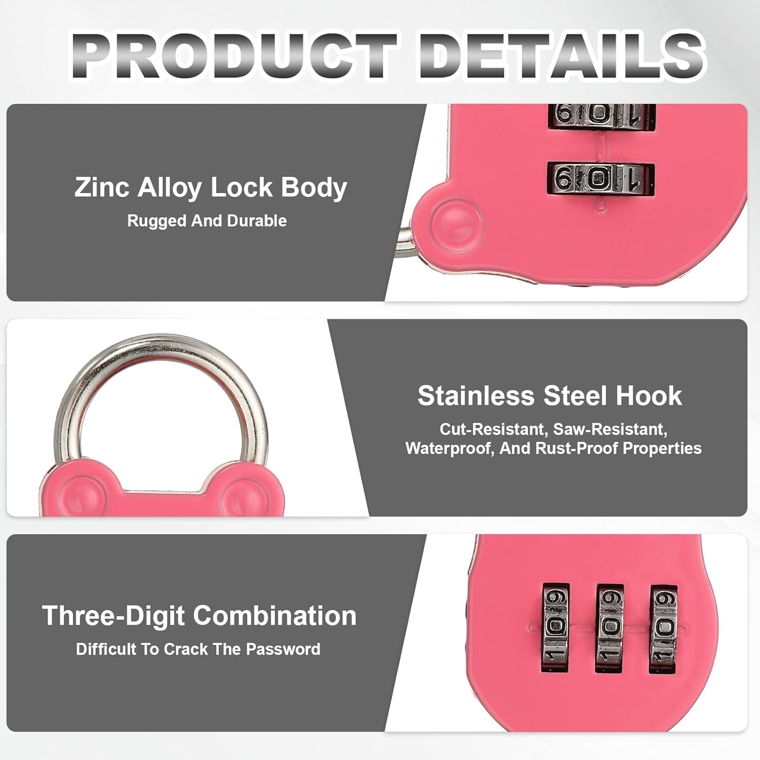 Reasons for Selection - This combination padlock features a durable zinc alloy body and a sturdy stainless steel shackle, making it excellent for cut and saw resistance, as well as water and rust resistance. This combination lock is compact, lightweight, and features a 3-digit combination, which to 1000 password combinations can be set, making it difficult to crack.Specifications -Material: Zinc Alloy; Color: Pink; Size: 32.5 x 48.5 mm / 1.28 x 1.91 inch(W*H); Inner Size: 17.8 x 15 mm / 0.7 x 0.59 inch(W*H); Shackle Diameter: 2.8 mm / 0.11 inch; Package Includes: 2 Pcs x Combination PadlockSuitable For -This shackle code lock is perfect for securing gym lockers, luggage, suitcases, storage boxes, toolboxes, cabinets, fences, outdoor gates, sports equipment, and backpacks. It's a suitable security accessory for personal, travel, home, and institutional use.Usage Tips -Reset the combination to the factory default (0000), then open the shackle and rotate it 90 degrees counterclockwise. Then, press and firmly hold the shackle down. While holding it down, turn the dials to set your new combination, aligning the chosen numbers with the arrow marks. Finally, release the shackle and lock it to complete the process.Kind Tips -Please carefully check the size information before purchasing to ensure the product fits you.