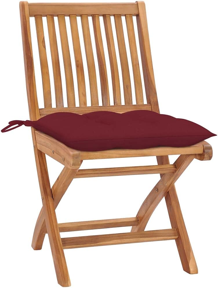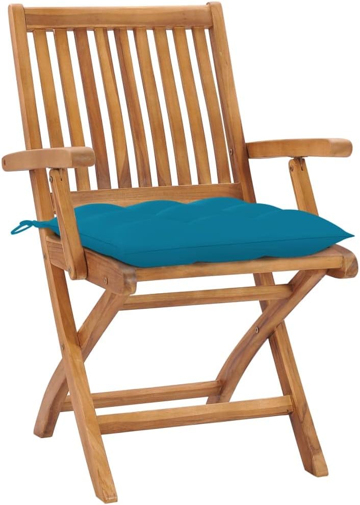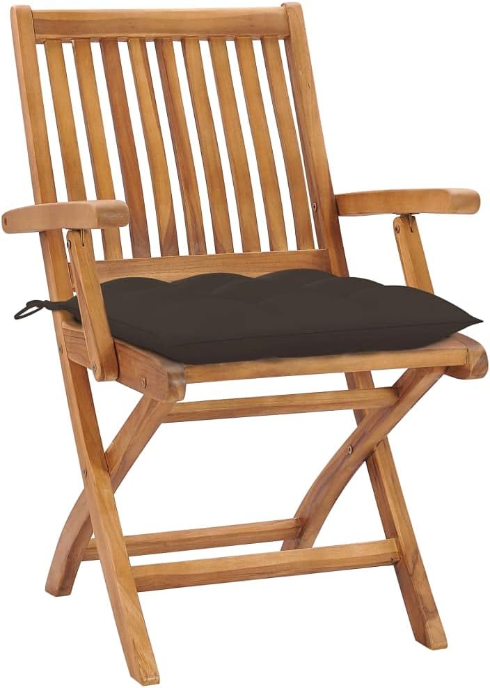 This stylish set of 2 wooden patio chairs features a timeless design. The outdoor chairs suit s, such as homes, offices, bars and cafes, thanks to their simple yet stylish design.Constructed from extremely durable teak hard wood, this piece of teak furniture has been seasoned, kiln dried and then fine sanded to give a very smooth appearance. Teak wood is known for its exceptional strength and weather resistance, making it far more suitable for patio furniture than any other kind of wood. Teak wood is the choice if you want to purchase a long lasting piece of patio furniture.These patio chairs can be folded to save storage space when not in use. The thickly padded seat cushions, curved seat and backrest also provide extra seating comfort.Cushion color: Cream whiteMaterial: Fine sanded teak hard wood with waterbase finishCushion material: 100% polyesterDimensions (unfolded): 18.3" x 22.8" x 34.6" (W x D x H)Dimensions (folded): 18.3" x 42.5" x 4.7" (W x D x H)Seat width: 18.3"Seat depth: 16.3"Seat height from the ground: 18.1"Cushion dimensions: 15.7" x 15.7" x 2.8" (L x W x T)FoldableAssembly required: NoDelivery contains:2 x Garden chair2 x Seat cushion