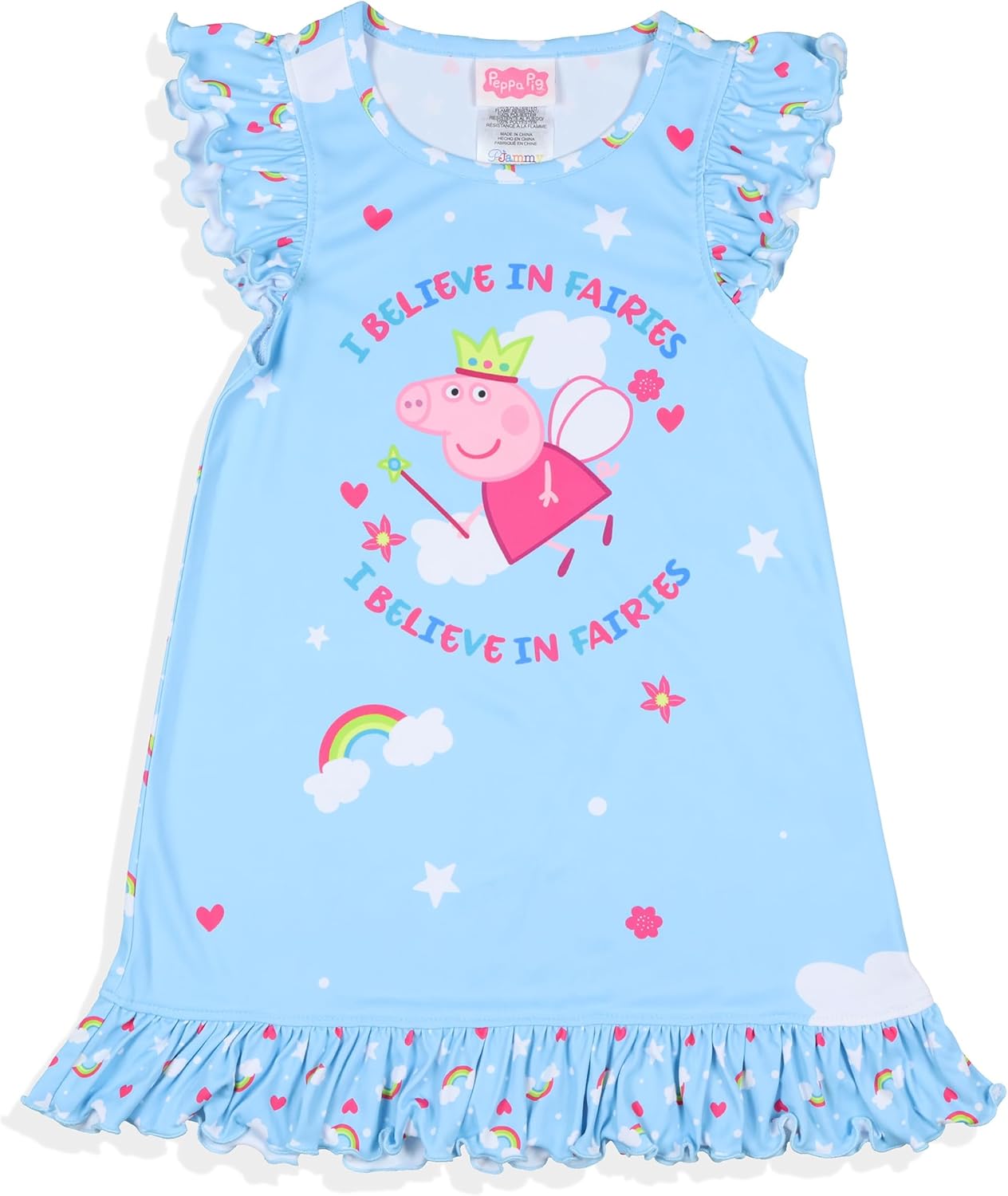 Make bedtime an exciting task for your little one with this fun 2-piece Peppa Pig nightgown pajama set! This Peppa Pig pajama nightdress features a fun graphic print of Peppa Pig with the text "I Believe In Fairies". Included in this set is a matching pajama nightgown for your child's favorite doll (doll is not included). Nightgown has a fun ruffle trim at the bottom of the nightgown and fun ruffle cap-sleeves. Pajama is made of soft and durable polyester fabric. Your child will be cozy all night long in this adorable nightgown. Great for any season, your child will love lounging with her favorite doll in this pajama nightgown. To help maintain the softness of the fabric and the vibrant color, please machine wash inside out on cold water and tumble dry on low.