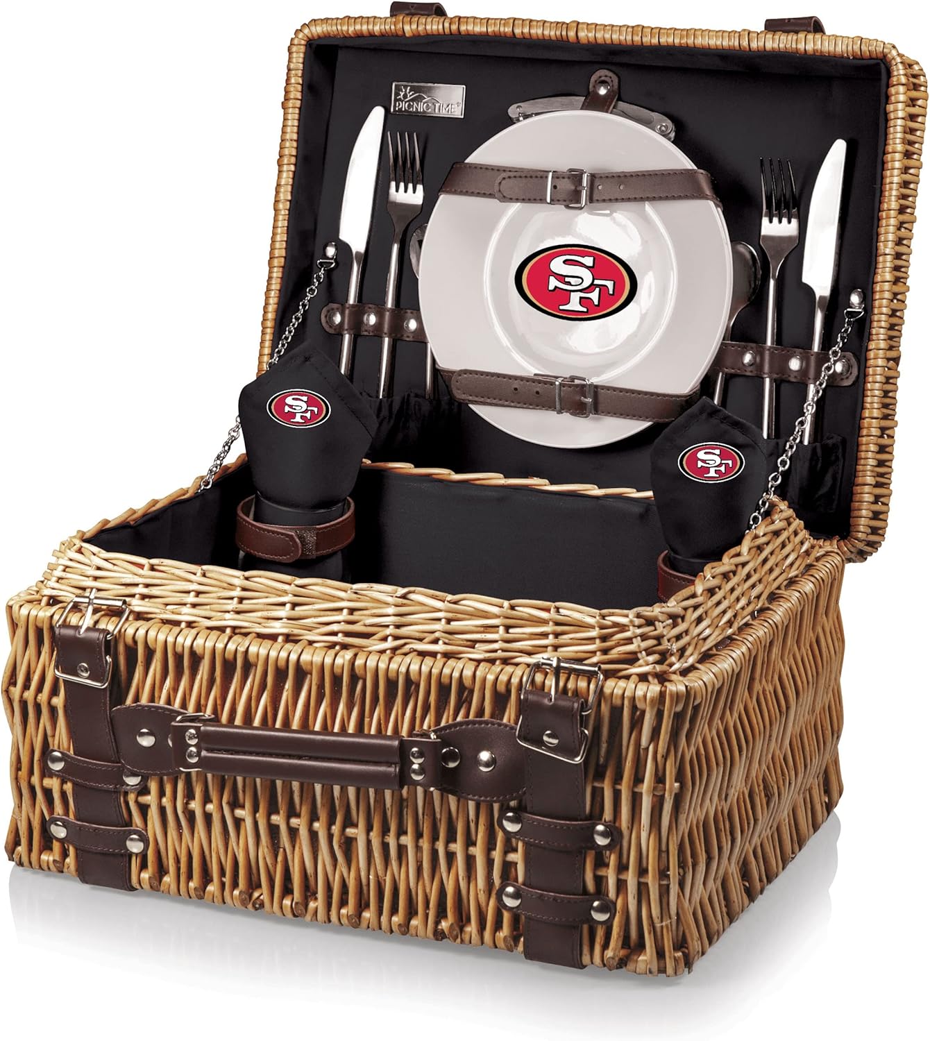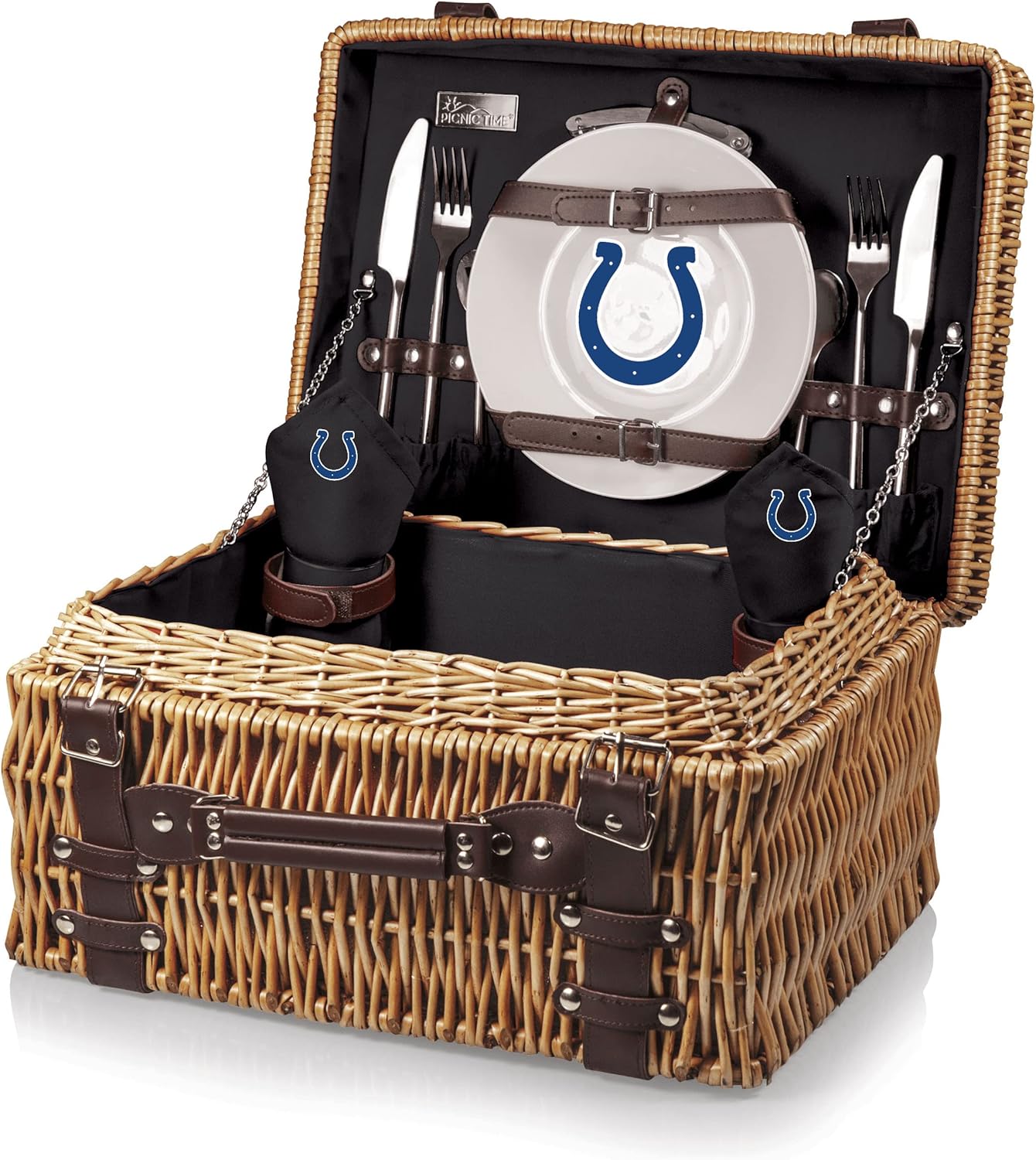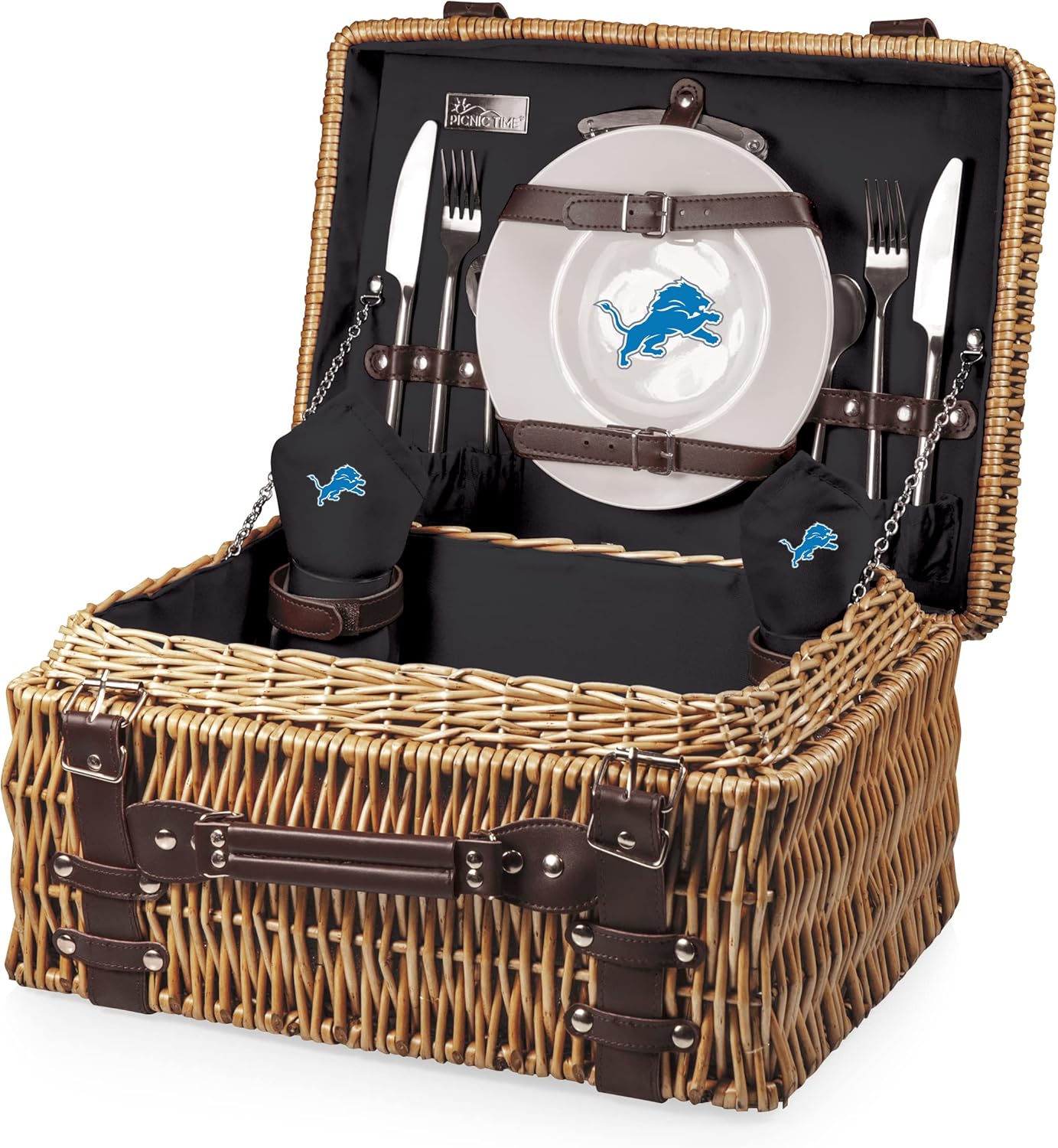 At once modern and classic, the Champion Picnic Basket provides picnic service for two in a sturdy willow wicker body with a reinforced leatherette handle and matching leatherette fastening straps. The basket's solid-colored lining and napkins make for a bold look that contrasts nicely with two porcelain plates, two hand-blown wine glasses, stainless steel cutlery, and a stainless steel waiter-style corkscrew. This picnic basket set is equally at home in the countryside or the stadium.