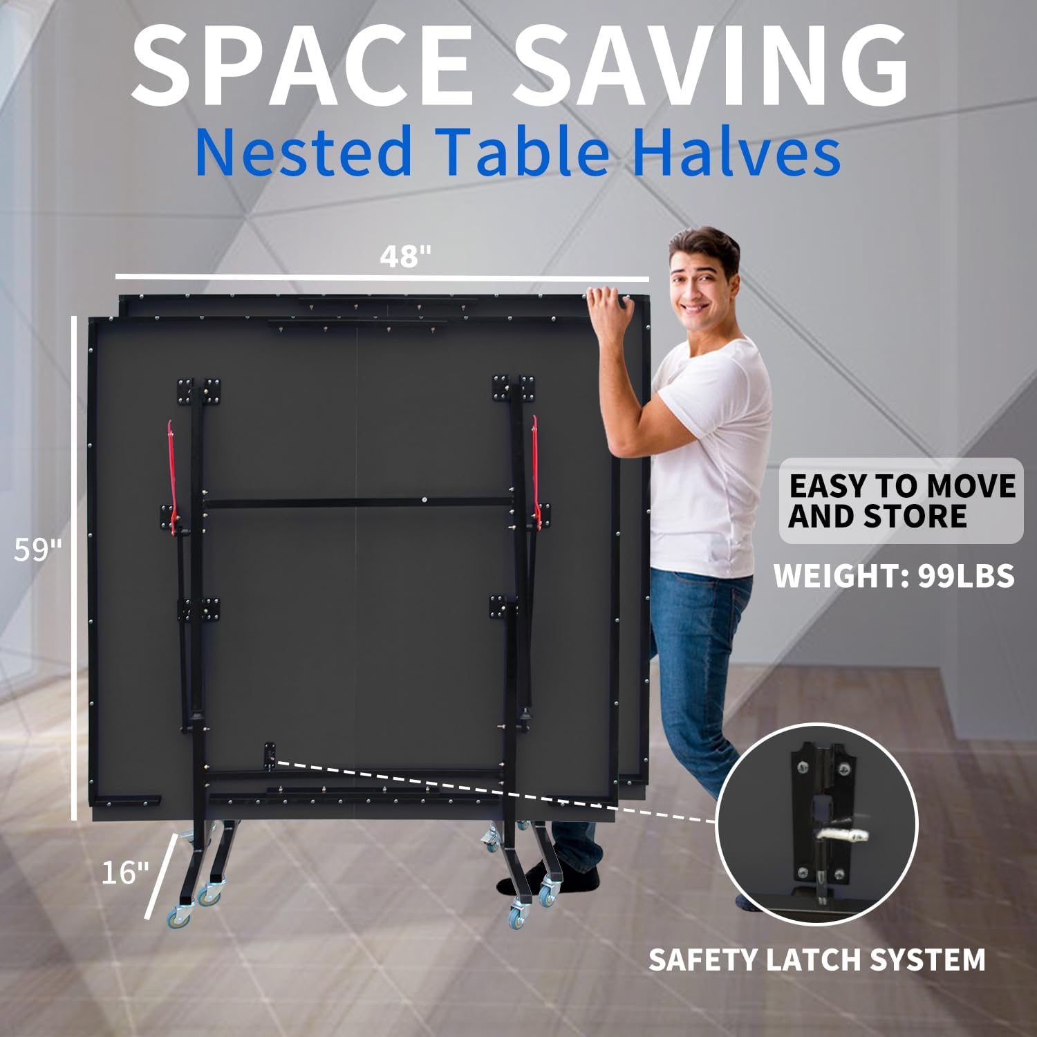 Bring families together for an exciting table tennis game!Ping pong is a game with low demanding that fits for all ages and abilities. Perfect for taking a break of work with colleague or play with kids on weekends, it can bring families together.Features:➤ Lockable wheels for portability.➤ 8'x 4' space-saving table tennis table.➤ 1/2” MDF tabletop with silkscreen striping.➤ Turn into single playback mode to practice yourself.Specifications:➤ Dimension: 96”(L) x 48”(W) x 30”(H)➤ Package Includes: 1 x Table Tennis Table, 1 x Net and Post Set, 2 x Table Tennis Rackets, 3 x BallsThis 8'x 4' space-saving table tennis table is a perfect gift for your kids to have fun.