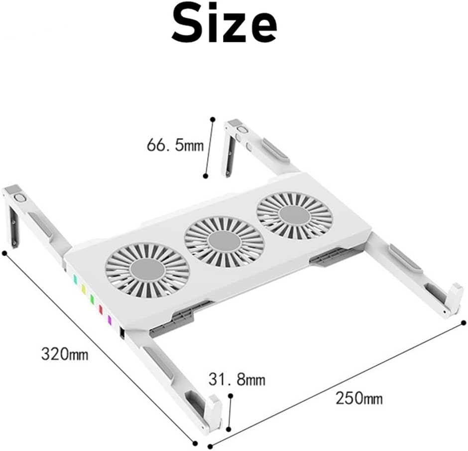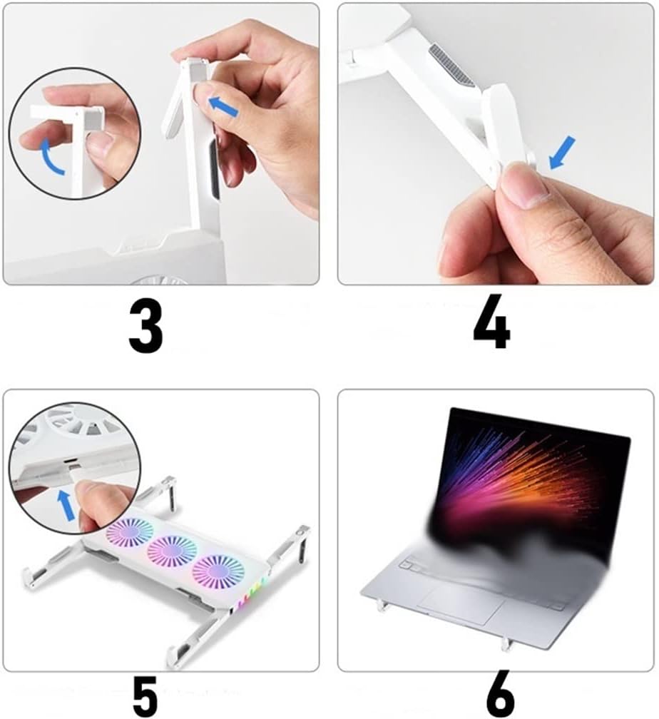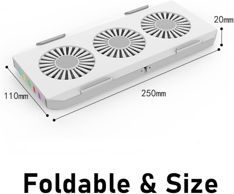 Product description:Quiet Motor FanColored ambient lights are more beautifulFoldable, easy to carryThree RGB cooling fans no heat and no crashesFast cooling, three cooling fansProduct parametersMaterial: absSize: 25*32*6cmcolor: WhitePackage Included:1 x Laptop Cooler (other demo products not included)Notice:1. Due to manual measurement, please allow 2-3% error.2. Due to different monitors, the color may be different, please understand.Integrated Dust Filtration Extends Laptop Lifespan: This cooler fan features a high-density, removable dust filter that effectively protects the internal fans of laptops. It captures hair and debris, them from entering the vents, thus solving the common "pressure cooker" dust buildup problem, significantly extending the lifespan of your expensive gaming PC and reducing costly professional cleaningIntuitive Touch-Mute Button adjusts RGB lighting with a single finger, minimizing distractions. Configured memory function, the laptop cooler RGB eliminates repeated selections and brings itself alive when power