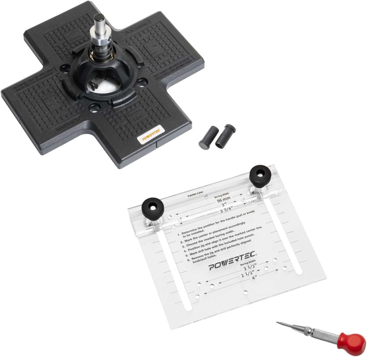 | Included Components | (2) Drawer Front Installation Clamps, (1) Drawer Pull Jig Template, (1) Automatic Center Punch, (1) Stop Plate, (1) 5-Star Knob, (2) Round Knobs, (3) T-Bolts, and (1) Powertec Universal T-Track |