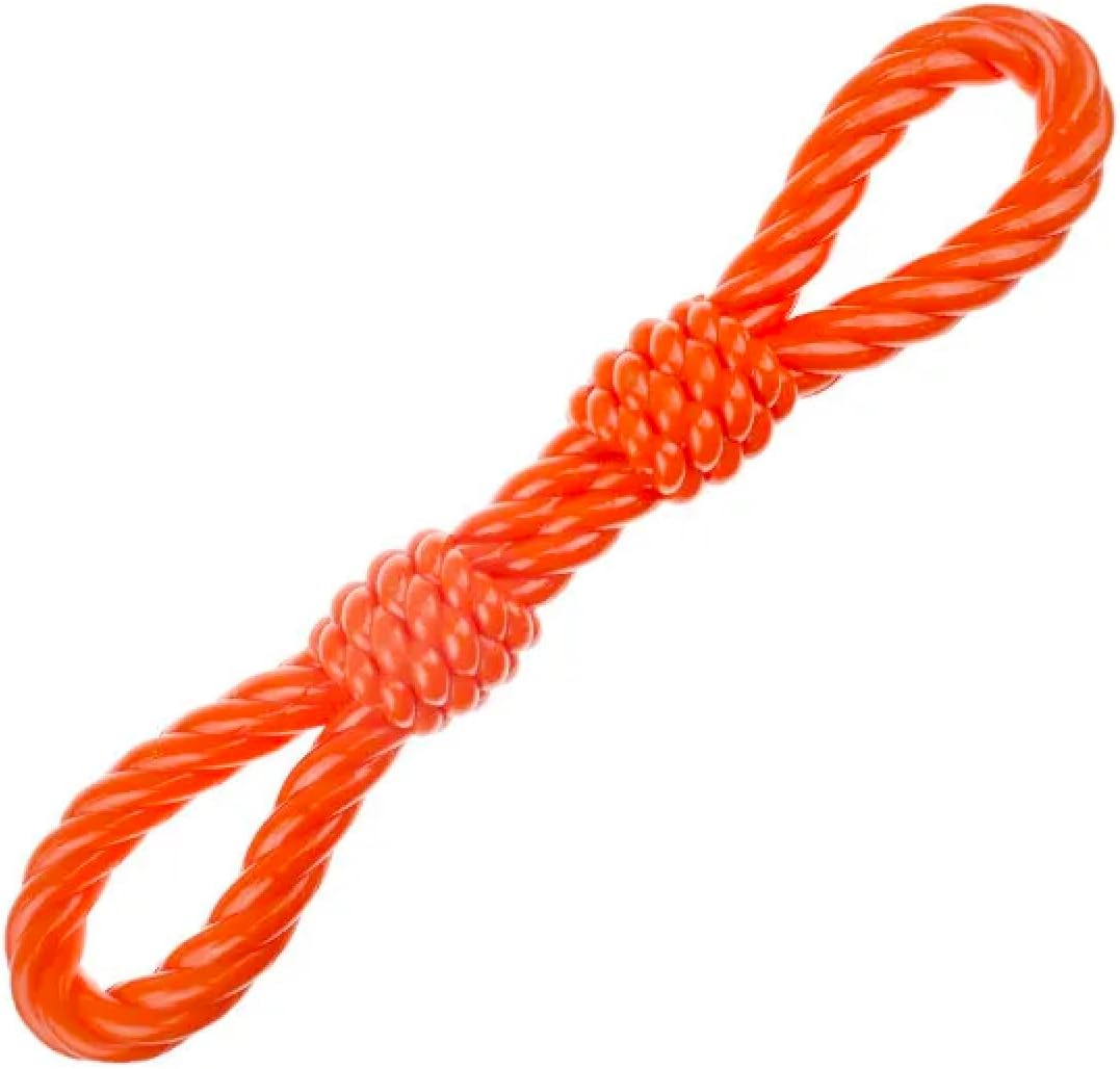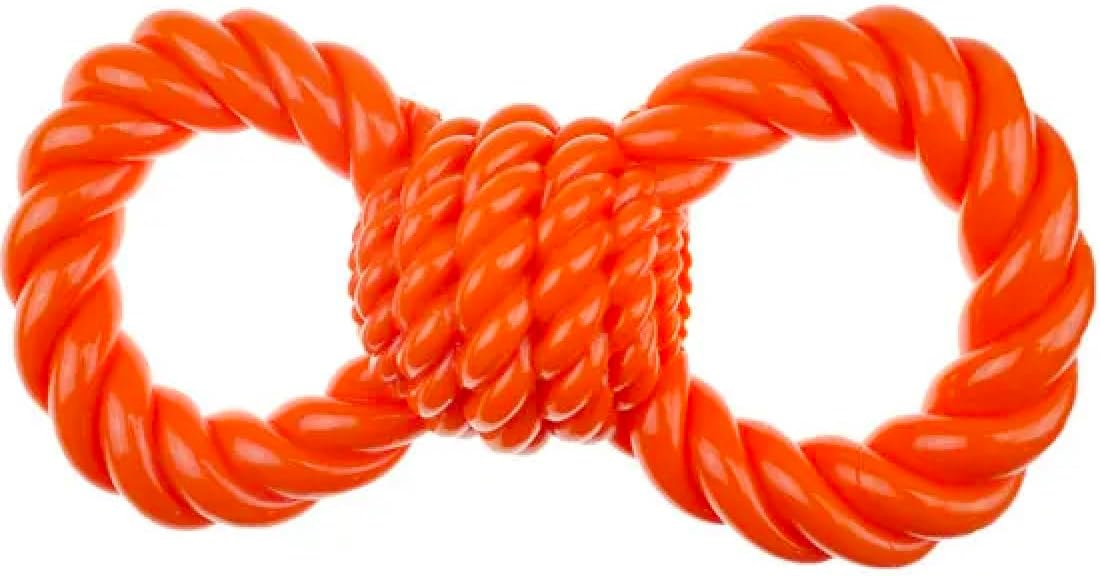 These Premium Hard Rubber Dog Toys are a great twist on the classic fetch sticks and toys. They're made of premium thermosplastic rubber so they can be chucked all day long. They, also all feature massage grooves to focus a fetcher's energy on the delightful textures. Bright orange color makes them easier for humans to find in tall grass or low light. Unique twist on classic fetch stick. Hard rubber toys are easy to clean and multi-textured to satisfying chewing urges. Premium hard rubber toys stand up to long hours of fetch and playing. Molded after braided rope, knots, tugs, rings and tassels - multiple textures stimulate gums as dogs chew. Promotes healthy chewing behavior, exercise, and bonding through games of fetch. Available in these shapes: 8" Knotted Rope, 8.5" Two Rings, 12" Double Ring, 12" Figure Eight, 14" Rope Bone, 17" Triple Knot, 18" Tug and Pull Tugger, 18" Double Fist or a cost saving set of All 8 Toys. Caution: Do not allow pet to play with toy if it becomes damaged. Supervision is advised.