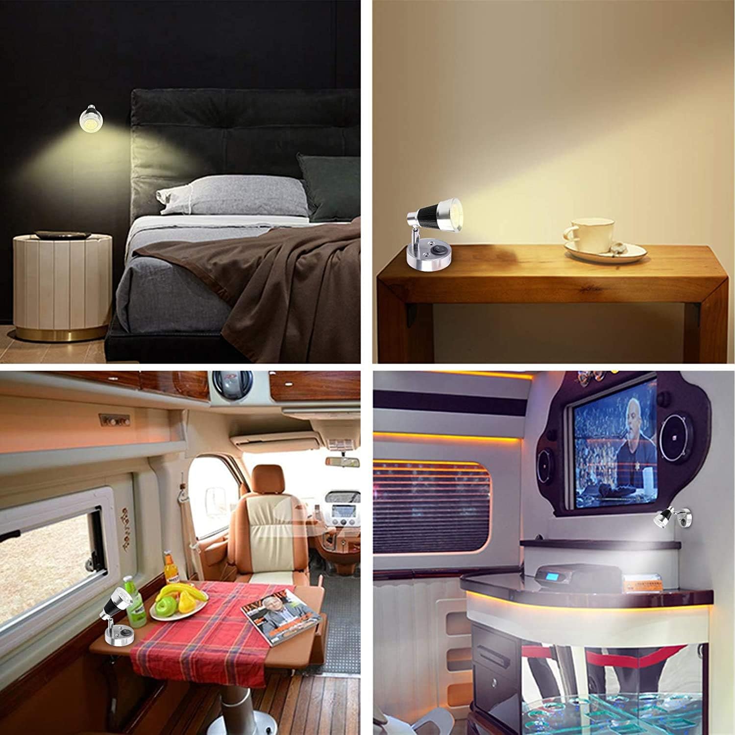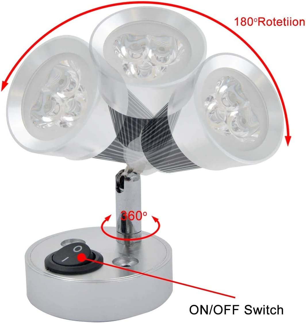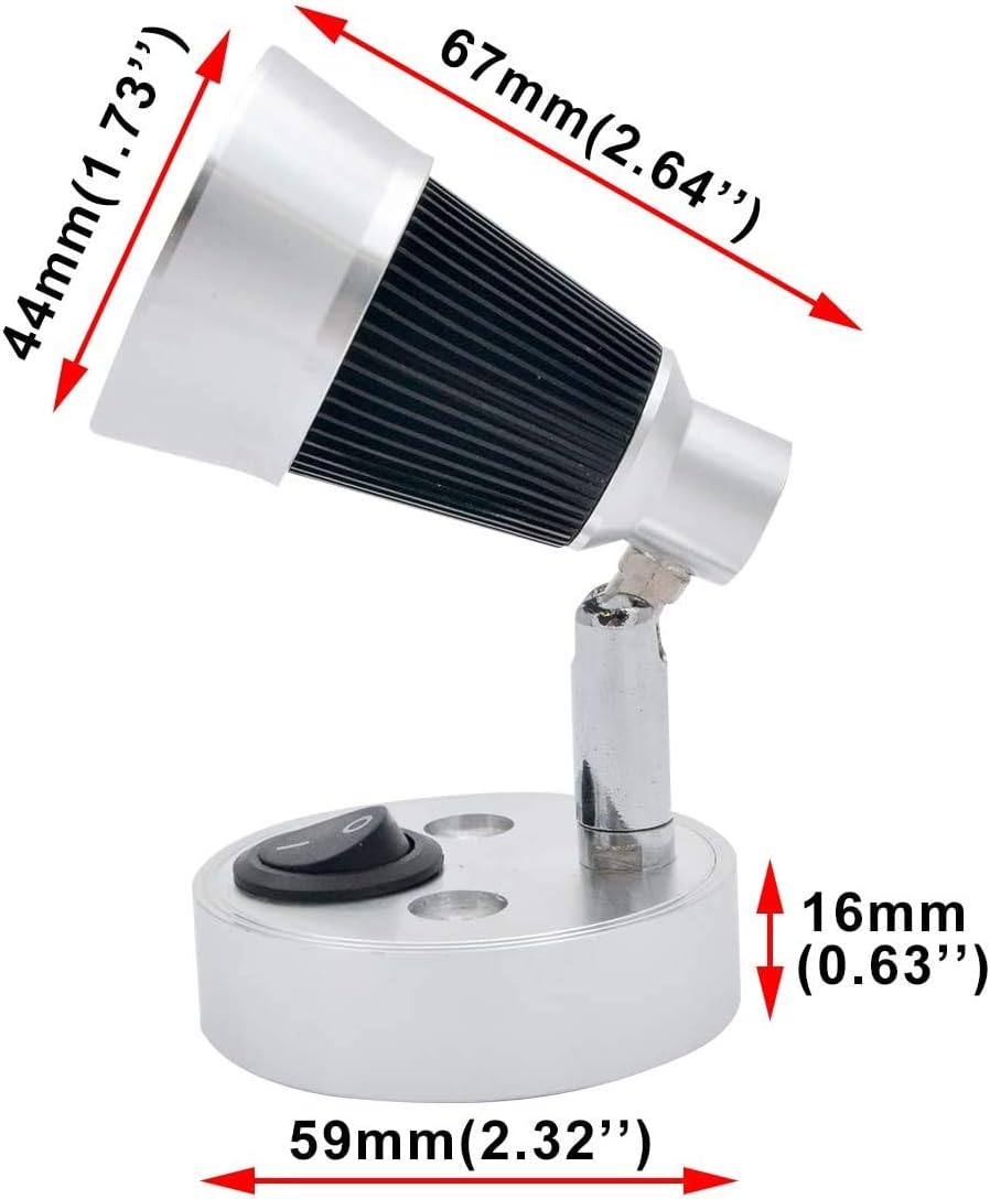 Specification Type:3 W Cree LED Material:Aluminum Voltage: DC 12V Light: D29MM*L50MM Base:D60*H25MM Color:White (6000K) Luminous flux:300 LM Features Over 3000 Hours working time. Brushed nickel finish Individually switched Adjustable head CE and RoHS approve Package Include 4 x Interior Reading Lights