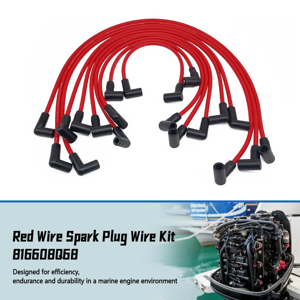Spark plug set 816608Q68 is used on V8 (350, 454 and 502 CID) General Motors marinized engines, fit for Delco HEI ignition systems (1993-2010). Complete set of 8 red wires with boots at spark plug end. Tailored to reach the correct plug location. Designed for efficiency, endurance and durability in a marine engine environment.