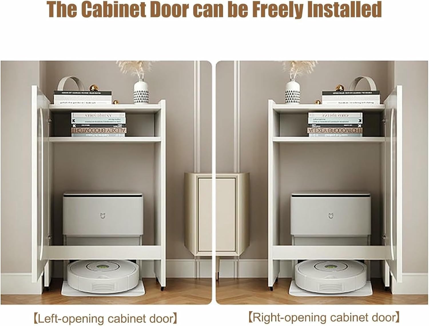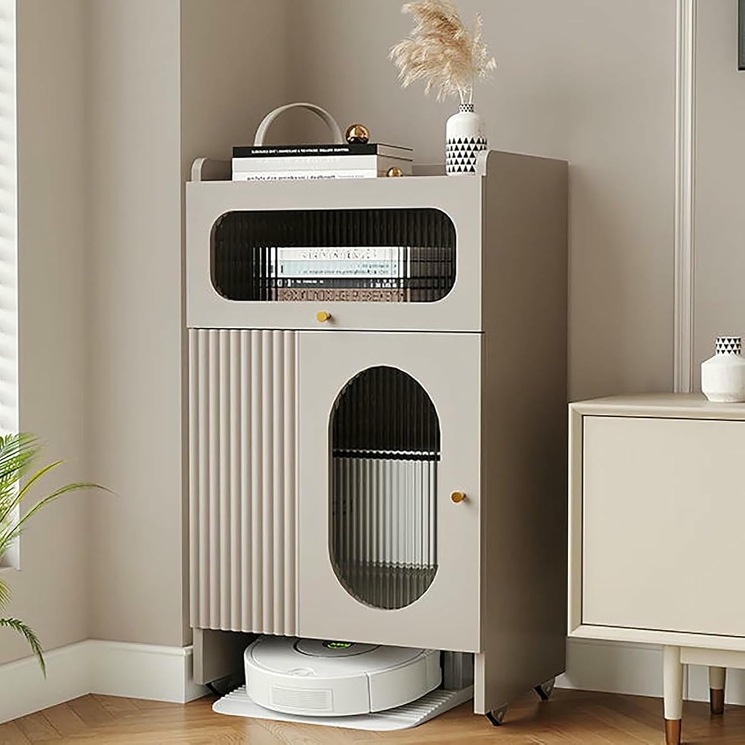 >>>Designed with ample storage space, the cabinet provides a dedicated area to store your sweeping robot while leaving room for additional items. >>>With smooth-rolling pulleys for easy mobility and customizable door installation, this vacuum storage cabinet doubles as a side table or end table, making it a smart solution for small space living.>>>Its versatile and stylish design makes it suitable for any room, blending well with modern interiors.【Features】*Spacious cabinet stores vacuum, tools, and daily essentials*Durable wood frame provides stable, long-lasting support*Smooth pulleys allow easy movement across any room*Doubles as a side table or end table for small spaces*Easy to install and simple to maintain【Product Specifications】*Material: Wood + Tempered Glass Door*Function: Wheels for easy movement*Applications: Living room, kitchen, bathroom, office, hallway*Features: Durable, stable, quiet operation, multi-scene application*Assembly Required: Yes*Package Includes: 1 × Robot Vacuum Storage Rack