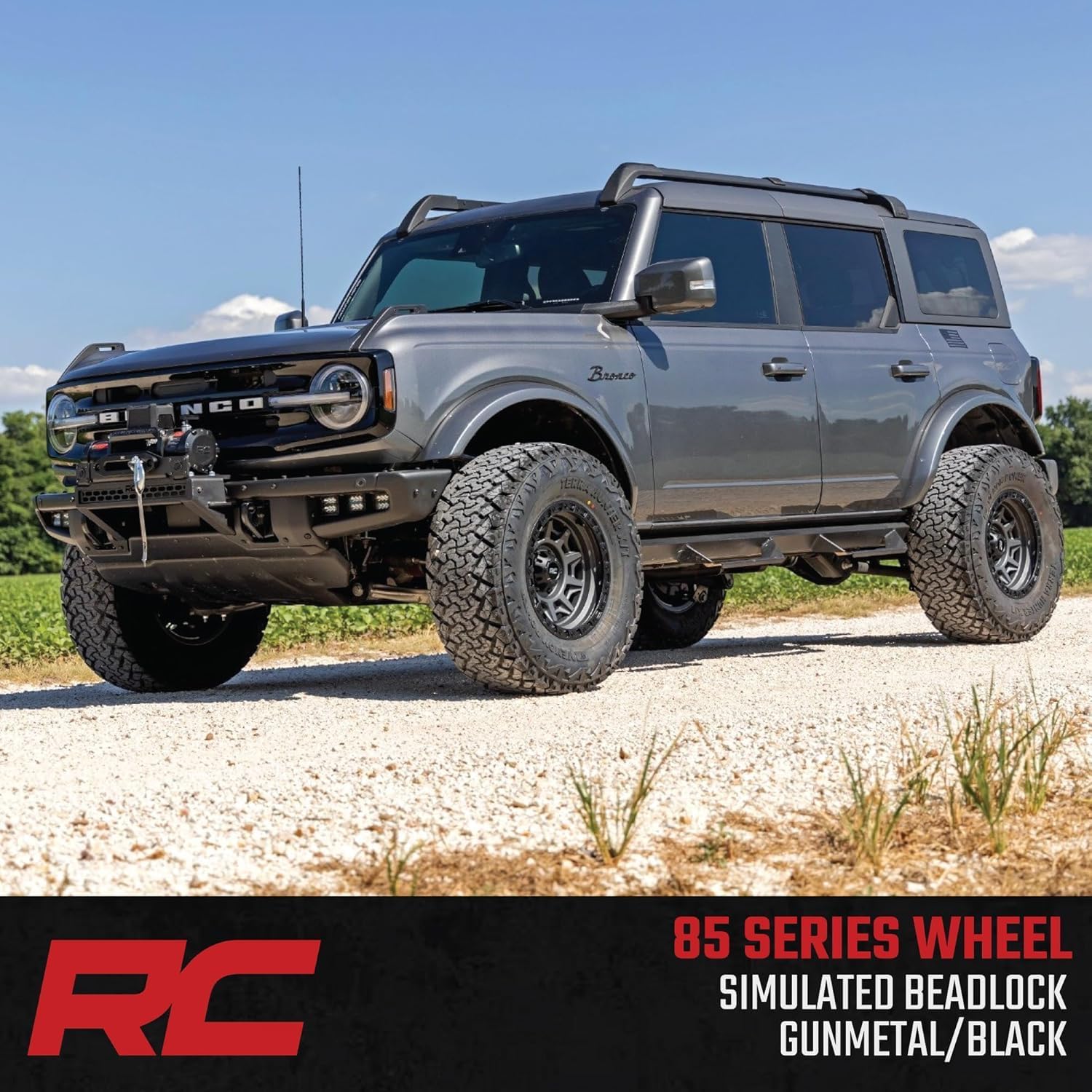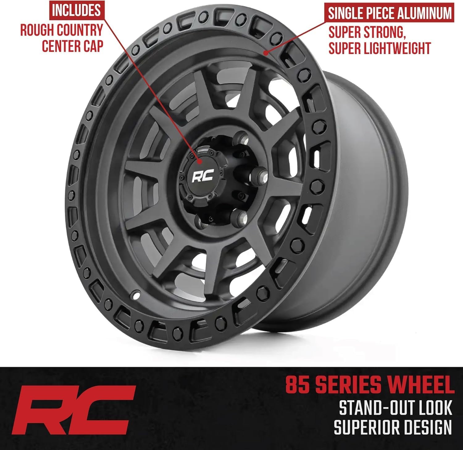 Stand-out Look. Rough Country 85 Series Gun Metal Wheels are built for maximum durability and strength with high-performance styling that ensures that it's ready to withstand anything on the street. Opting to upgrade your stock wheels will provide you with a rugged appearance and outstanding performance that you expect from Rough Country products. The 85 Series Gun Gray Metal Wheel is a must for anybody who wants to add a bold new look to make your ride stand out from the crowd.Superior Design. Our Series 85 Gunmetal Gray Wheels feature a high-quality gunmetal finish with matte black simulated bead lock and one-piece aluminum construction that delivers a strong, durable wheel. These gunmetal gray color wheels boast an aggressive design and include a Rough Country black center cap, so you can tackle the road in style. Rough Country's Gunmetal Gray/Black Wheels come with a 1-year finish and Limited Lifetime Structural Warranty.