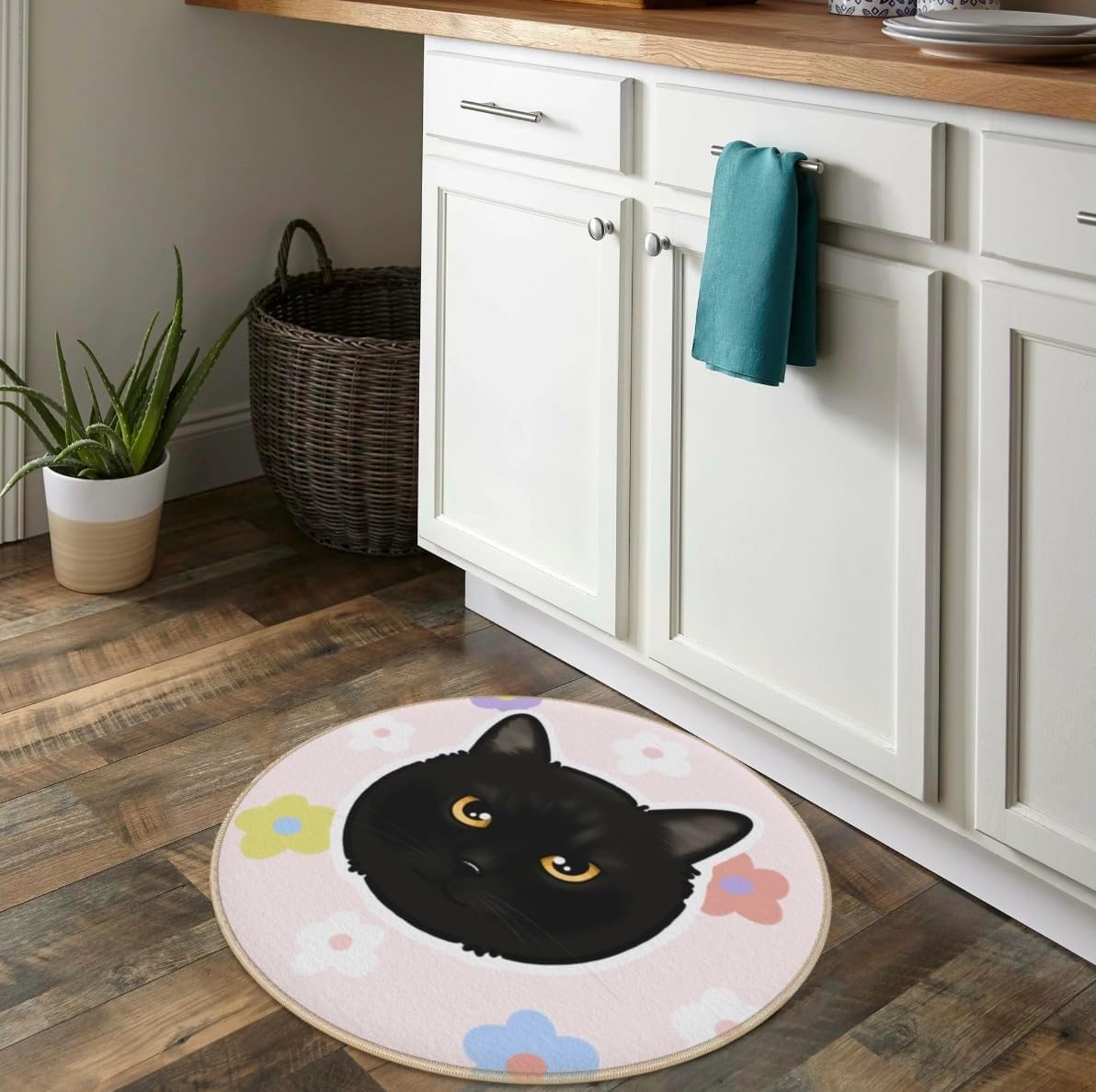 This charming round carpet adds a touch of playfulness to your living space with high-definition imported printing technology. Based on the photo provided by the user, we will use imported high-definition printing technology to print the pattern in the center. The circular outline and elegant golden border create a perfect frame for this eye-catching design. This versatile carpet can show an excellent effect in the living room, bedroom or bathroom. The flat-woven structure ensures its durability while maintaining a simple shape. This customizable carpet allows you to express your personality through floor decoration and add comfort and fashion to your space. The balanced composition and attention to detail make this carpet an ideal choice for those who want to add character and practicality to their home decoration.