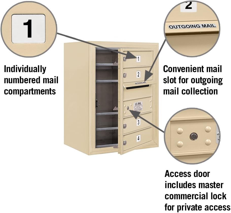 Salsbury 3800 series surface mounted 4C horizontal stand-alone parcel lockers for U.S.P.S. Access are ideal for apartments, commercial buildings and residential developments. 4C horizontal stand-alone parcel lockers are constructed of heavy gauge aluminum and stainless steel hardware. Feature a durable powder coated finish available in aluminum, bronze, gold and Sandstone. Easily accessed from the front through 1 or 2 easy opening master doors or master keys. Parcel lockers varies in 5 sizes. Available in configurations that are 1 door wide (single column) and 2 doors wide (double column). some stand-alone parcel lockers comes with outgoing mail compartment. Carrier access door includes the U.S.P.S. Master lock access door (lock installed by the U.S.P.S.) and cannot be used for mail distribution. Salsbury Industries is an ISO 9001: 2015 certified company and has excelled in the field of manufacturing since 1936..Salsbury Industries 3806S-04SFP Surface Mounted 4C Horizontal Mailbox Unit (Includes 3706S-04Sfp Mailbox, 3806S-San Enclosure & Master Commercial LOCK) - single Column - 4 MB1 Doors - Sandstone - Front Loading - Private Access Centralized Mail Delivery - Private Access