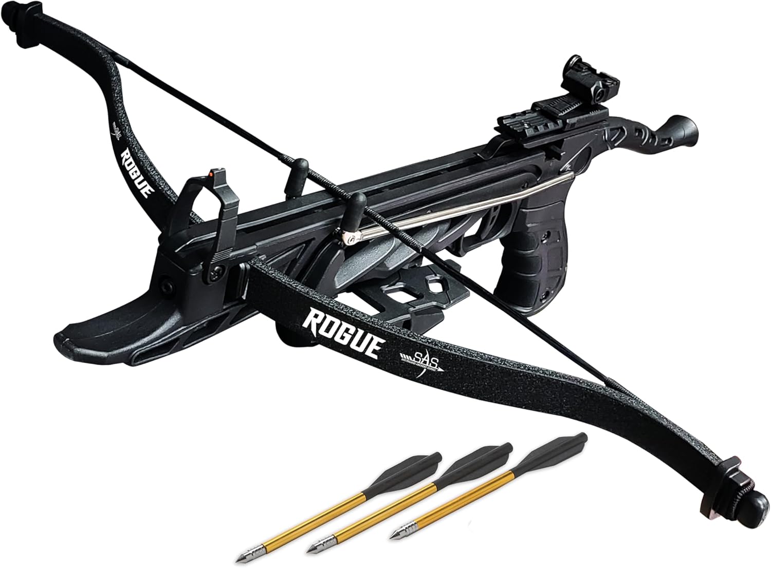 Overview: These pistol crossbows are easy to cock and simple to use but they should not be confused as toys. They are powerful and can release a crossbow bolt at high speeds over a good distance. Unlike full size crossbows pistol crossbows do not require a lot of energy to cock, so many crossbow bolts can be fired in a very short period of time. This is a break action, semi-automatic loading pistol crossbow having an 80 lb draw weight, adjustable rear sight and bead foresight. Highlights: 80 lbs draw weight Arrows travel up to 160 FPS Package Contents:1 x 80 lbs Pistol Crossbow 1 x String 2 x End caps 3 x Aluminum Arrows Optional Bag Package Contents:1 x 80 lbs Pistol Crossbow 1 x String 2 x End caps 1 x SAS Pistol Crossbow Bag 12 x Extra Aluminum Arrows