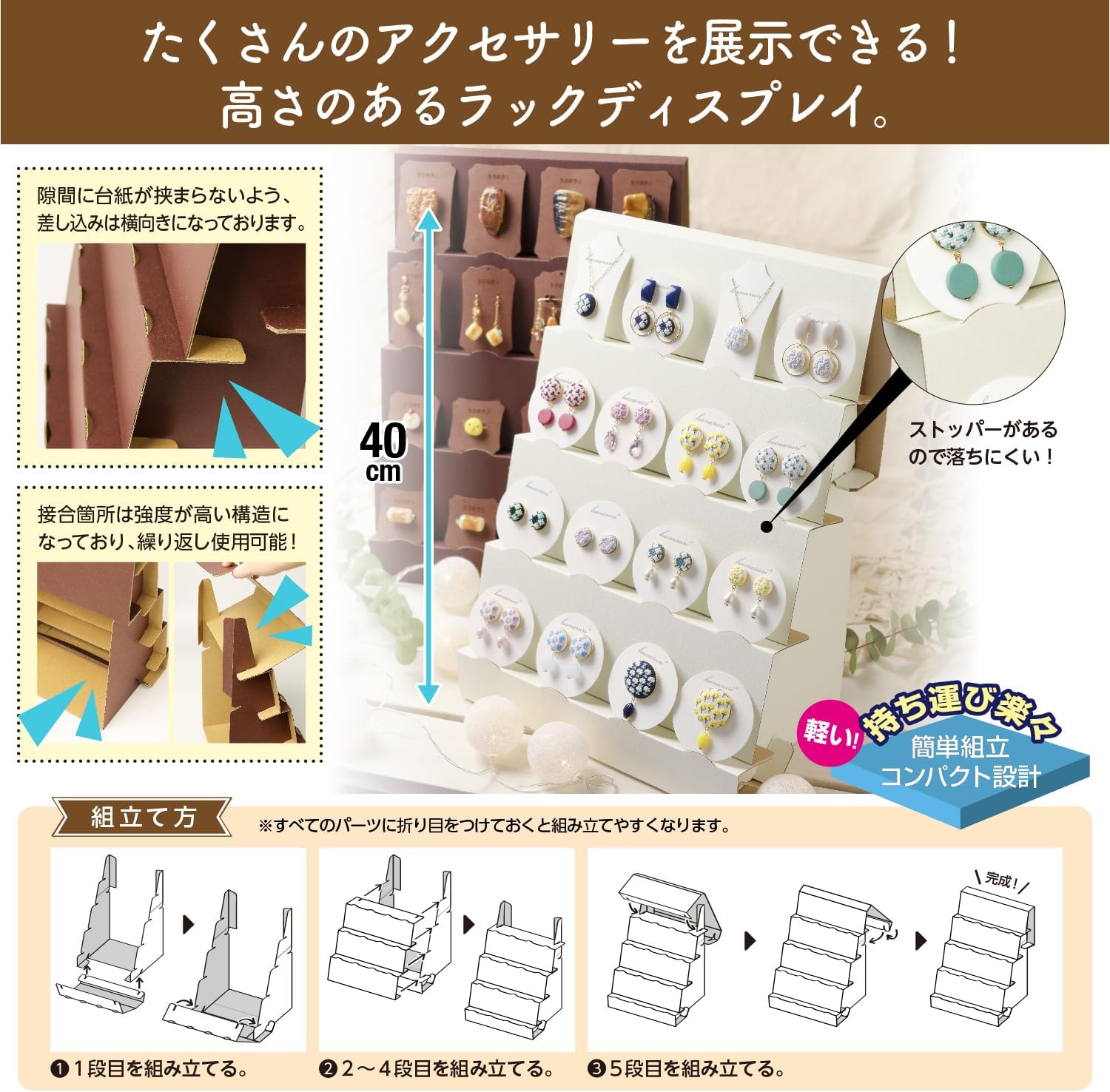 Displays many accessories. Raised rack display These paper fixtures have a narrow gusset that allows you to efficiently display your artwork in a space saving manner. The height allows you to display more projects and the stopper keeps the mat neatly aligned for easy access to customers. Since it is made of paper, it is lightweight and can be assembled, so it is not bulky and easy to carry when transporting or transporting it. Use with the "support stand" (sold separately) for a higher display. It also goes well with the 3-tier decorative shelf and 5-tier decorative shelf. Make great use of dead space! There is a small window on the reverse side for storing small items. Textured paper on the surface!