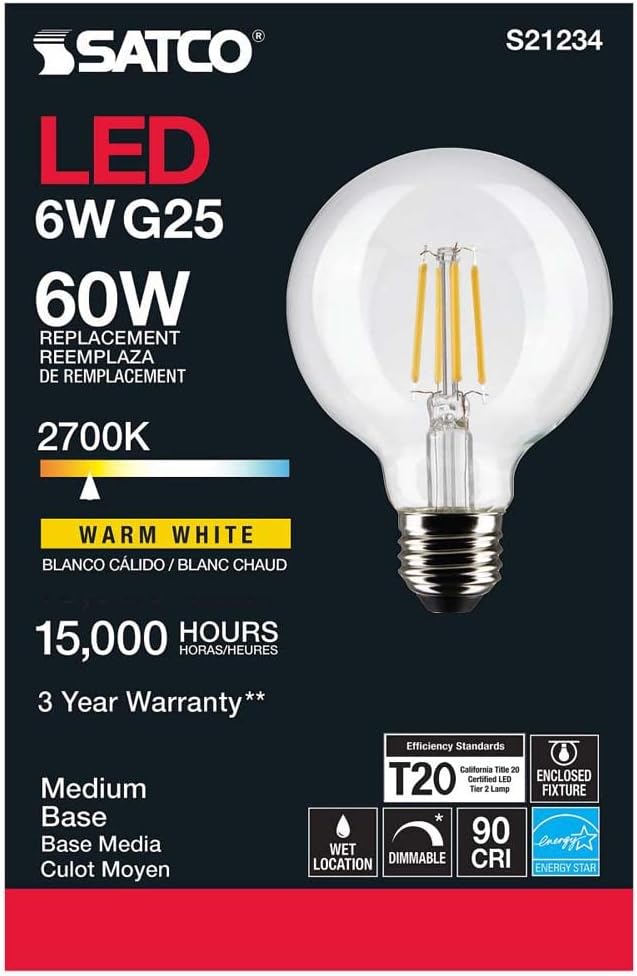 Satco's S21234 6-watt LED lamp is traditional, yet contemporary with its vintage style and energy saving LED technology. Elegantly illuminate any room in the house with this dimmable, globe shaped bulb. Sophisticated and modern, this lamp delivers 15,000 hours of warm white light.