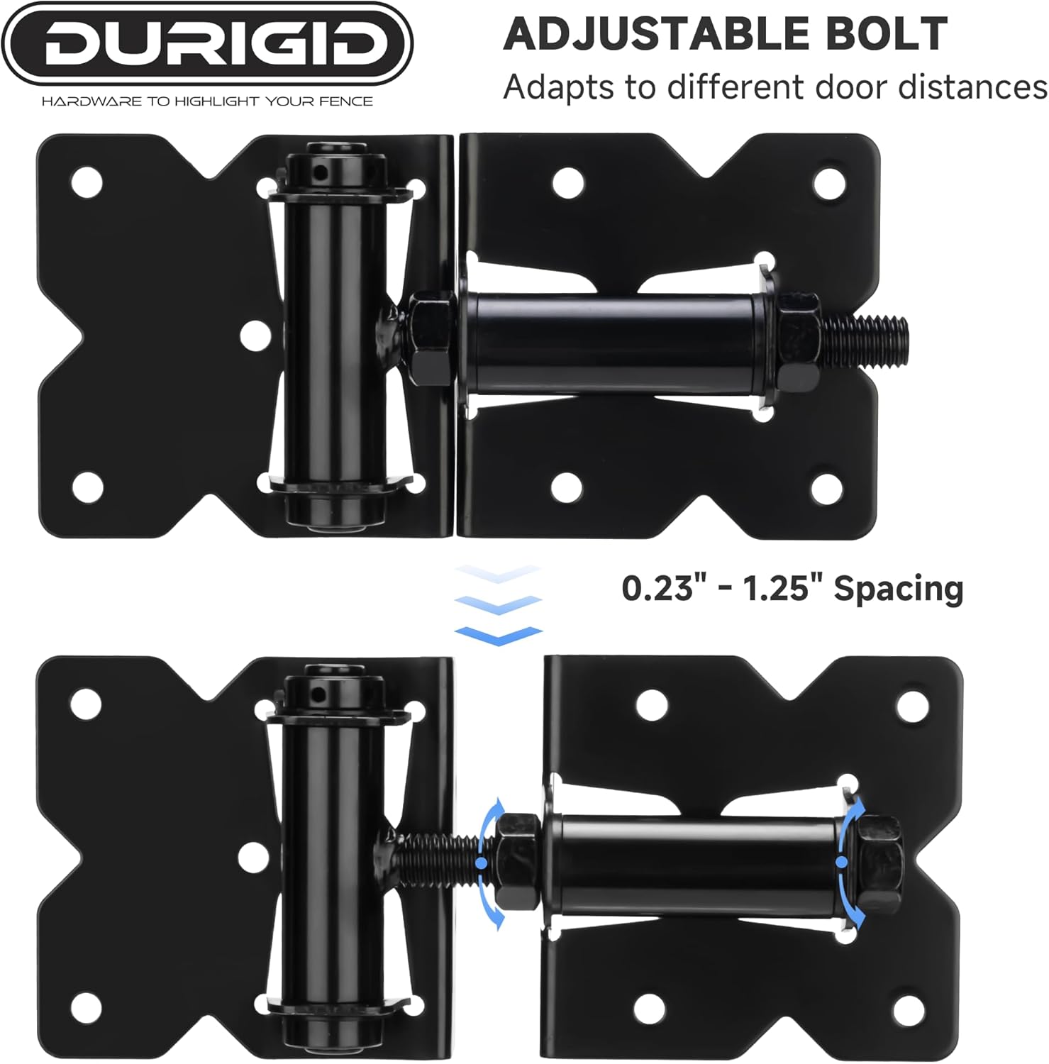 Product Features: The self-closing gate hinge automatically closes for enhanced safety and convenience. Adjustable spring tension for custom closing speed, durable one-piece construction, easy installation, and fits various gate types like wood, vinyl, and metal. Built from a single, weld-free piece, this hinge eliminates concerns about breakage at welded joints. The hinge spacing is adjustable to accommodate gaps between the post and gate from 0.23" to 1.25". Package Includes: 4 Pair x Self Closing Gate Hinge 2 x 22 x Vinyl installation Screws(not Wooden Screws) 1 x Adjuster Tool 1 x Installation Instruction