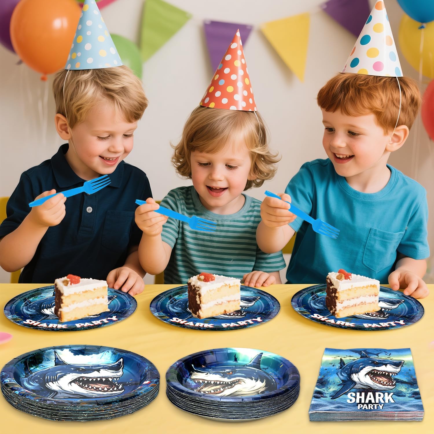 Shark-Themed Party Design: This shark party supplies set is designed for kids. ferocious and wild, attractive shape design, meets your children's desire for strength and power. Transform your party room into a blue shark ocean world with this shark birthday decoration set, it is very suitable for boys' parties. Using it in your party, this shark party favor will help you create unforgettable memories with family and friends.