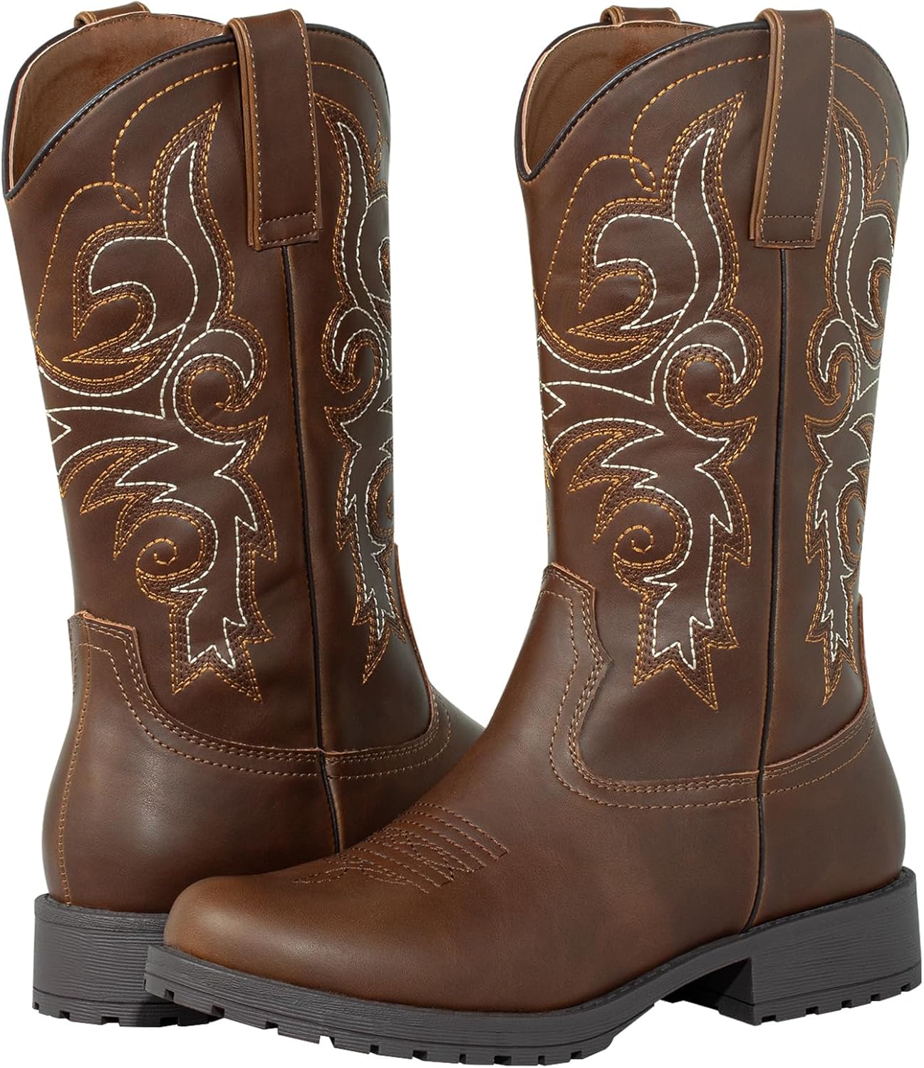 Discover Your New Favorite Boots: Where Classic Style Meets Modern ComfortAt SheSole, we believe you should never have to compromise. That's why we've created a Western boot that honors tradition while embracing the comfort you deserve. Step into a pair of boots designed not just for looking good, but for living. Vintage and Comfortable Cowboy Boots for Women Timeless Look:With a classic round toe and beautiful embroidery, these boots have an authentic Western charm. Slip Resistant & DurabilityThe sole is securely stitched and made from non-slip rubber, giving you the confidence to walk or dance on any surface.Easy On, Easy Off:Our smartest feature is the stretchy side panel. It allows you to slip your foot in and out with total ease. No more struggling or pulling—just a simple, convenient fit every single time.From the Ranch to the RunwayThese round toe cowboy boots are the ultimate style chameleon. Their classic design makes them a versatile staple for any wardrobe. Pair them with denim for a rugged, authentic look, or with a skirt for a touch of bohemian chic. They are the perfect accessory for any occasion that calls for style, comfort, and a dash of cowgirl spirit.