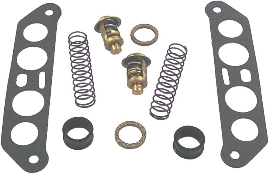 The Sierra 18-3673 Thermostat Kit is interchangeable with the following: GLM 13270. Contains: 18-0675 Thermostat Gasket, 18-0977 Thermostat Gasket, 18-2391 Grommet, 18-3564 Poppet Relief Valve, 18-1243 Valve Springs, 18-3543 Thermostat.