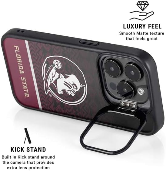 The Florida State University Pattern Jersey Kickstand Case compatible with iPhone 14 Pro Max is the ultimate in versatile protection and convenience. Featuring an innovative lifted camera ring with a built-in stand, it allows hands-free video watching with adjustable angles from 0 to 150 degrees. This premium Florida State Case supports wireless charging and is fully compatible with MagSafe, offering a sleek design without compromising on durability or functionality.