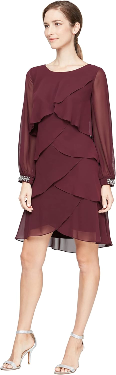 Elevate your special occasion wardrobe with the S.L. Fashions Women's Long-Sleeve Chiffon Cocktail Dress, a masterpiece of elegant design and versatile style. This stunning dress features luxurious multi-tiered layers that create graceful movement and a flattering silhouette for all body types. The sheer long sleeves add sophistication while the jeweled cuffs provide a touch of glamour perfect for cocktail parties, weddings, or formal events. Available in both petite and regular sizes, this dress ensures a perfect fit for every woman. The fully lined construction offers complete coverage and comfort, while the premium chiffon fabric drapes beautifully and moves effortlessly with you. The beaded cuffs catch the light with every gesture, adding sparkle and sophistication to your ensemble. The thoughtful design combines classic elements with contemporary style, making it an ideal choice for any formal occasion throughout the year. Perfect for mother of the bride, evening events, formal dinners, or holiday celebrations, this versatile cocktail dress delivers both comfort and elegance. The timeless silhouette and quality construction ensure this dress will remain a cherished piece in your formal wear collection. Machine washable for easy care, this dress offers both luxury and practicality for the modern woman.